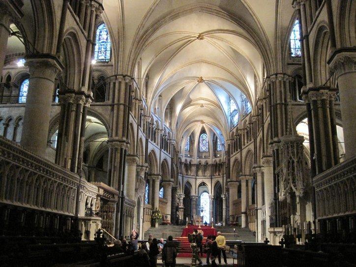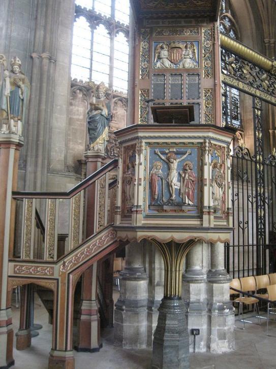 Unlike Catholic buildings, the decoration of Canterbury is not flamboyant. Dodie characterized it as dour, and said it did not seem the people behind this had much joy in their religion.