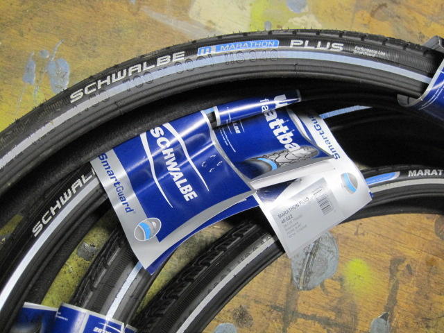 700C x38 seems to be a bit of a rare size for these Schwalbes, which are normally thinner, but they can be found, We like the wider tires and rims, hoping they will help to ward off broken spokes. (p.s. we are also carrying the FiberFix spoke - because a broken spoke on the drive side would be a real real bug!)