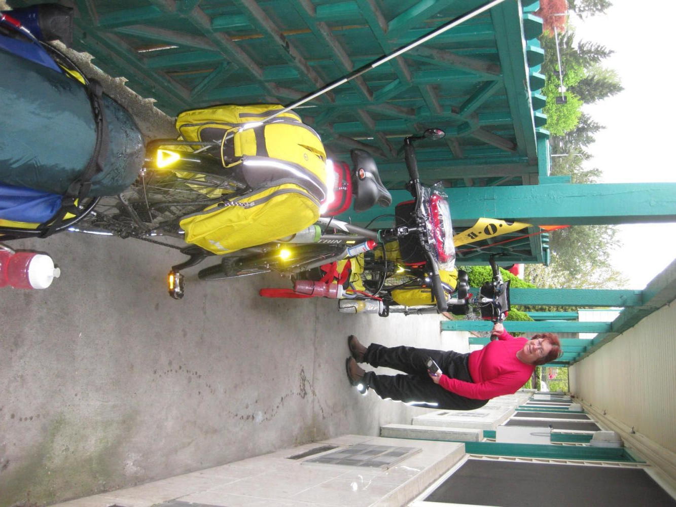 Another cool,rainy day. Nothing that would drown or freeze us, but just enough to have everything wet and give our faces something like windburn. The little breezeway at the fire station sheltered our bikes as we packed, a big bonus. We also charged our electric toothbrush, a double bonus!