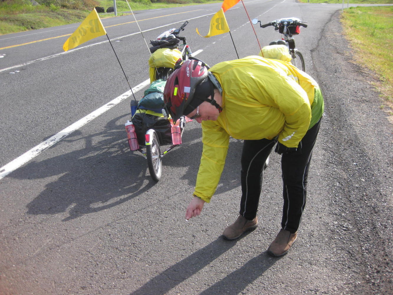 Narrow or no shoulder, as mentioned on other days, is better for your powers of concentration than a course in Zen. Very zen-like too were my thoughts on having an SUV whiz by within a foot. I didn't hear it coming, and it all would have been over in a second. Not a bad way to go. The alternative, hearing a huge powerful machine come up behind you, before being ripped to shreds, would no doubt be measurably less pleasant. Can you tell we are a bit freaked by this road??