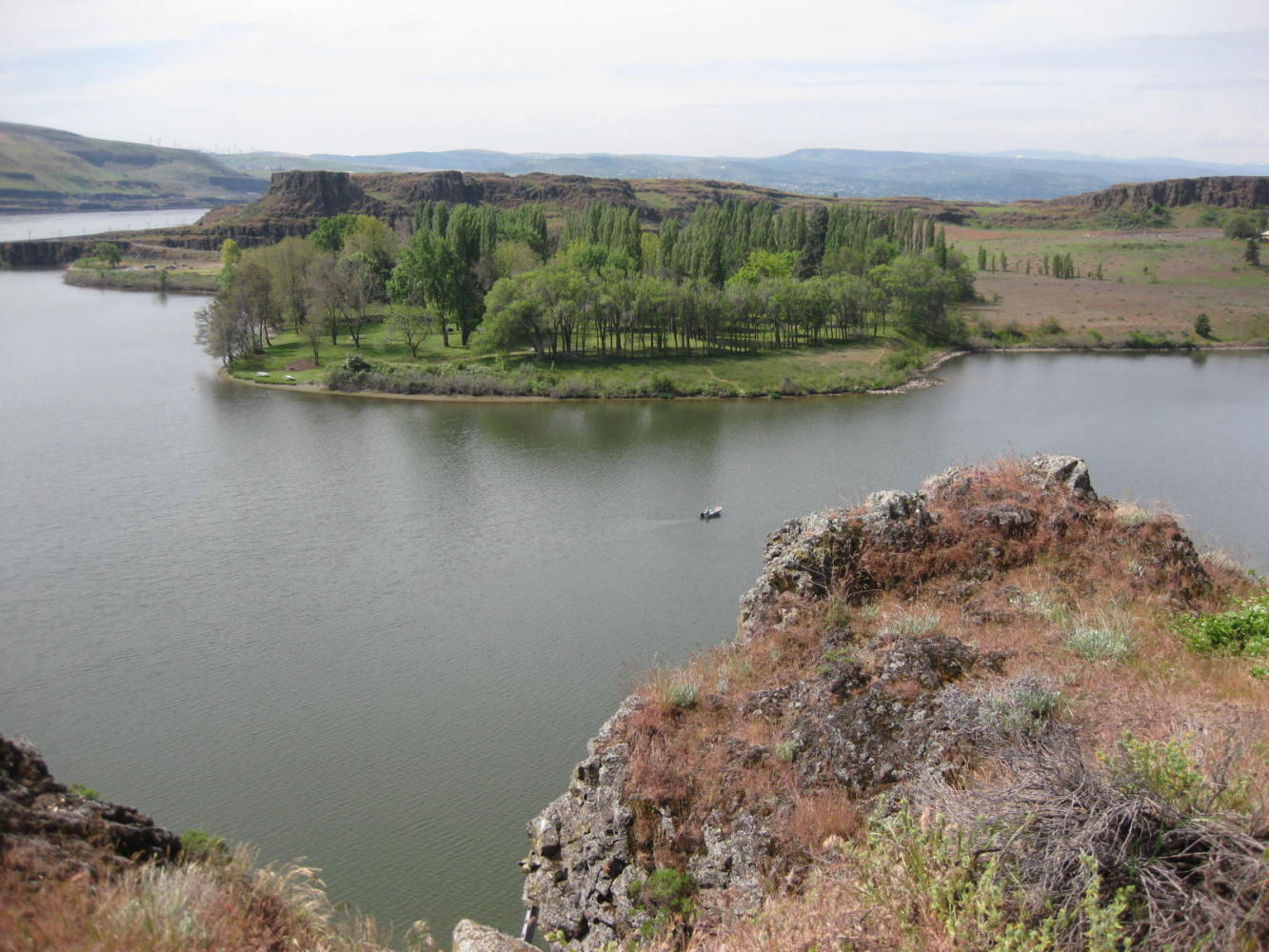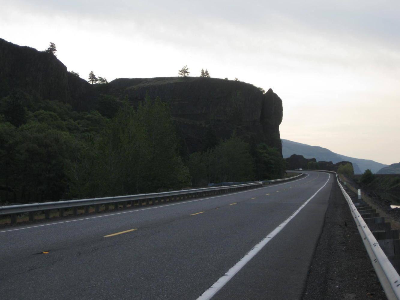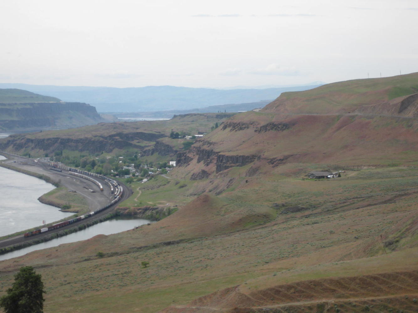 The road lost its manners, though, about 15 km out of Wishram. About there it began an ascent into the hills overlooking the River. It climbed 200 meters and then undulated up and down, but mostly up. We could easily look across the river and see the dead level I-84 following the shoreline. But for now we were still glad of the relatively traffic free and quiet road, and could anticipate somne R&R soon in Wishram. We, of course, knew nothing of where or what Wishram was, but hey it earned a dot on our Washington State map, didn't it?