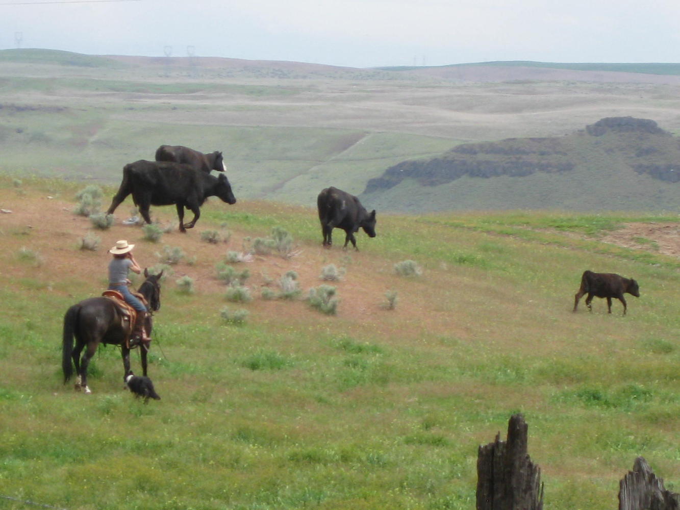 We started out still on the "coast" at White Salmon, but by Chamberlain Lake just 15 km down highway 14 it was clear that we were in a different world. Pine trees now dominated, and the surrounding hills were partly bare. Another 15 km and I exclaimed "wha happened? Are we in Arizona?". The Gorge, too, opened out and we could see up and down it for miles. The delicate colour tones of the hills, not to mention all white Mount Hood peeking over the top, were far too difficult for our little camera to capture. We ran in to real cowboys (and girls) and those fat squirrels that are, or are related to, the Franklin Ground Squirrels found in our own Rockies.