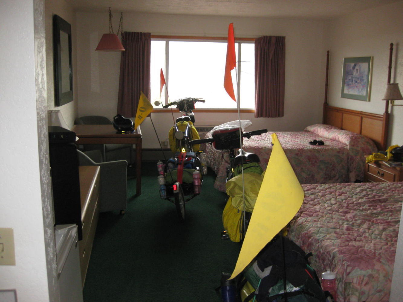So instead of descending to the Park and ascending back up next morning into 100 km plus of nothing, we went down the hill and hightailed it over the bridge to Biggs, Oregon. Our cyclist had warned "it's no resort" but we checked in to Dinty's Motor Inn, and it was a resort to us - a last resort. No sooner had we opened the door to our room but the heavens opened and a torrential downpour began. The bikes were safely inside, and we were dry and home free!
