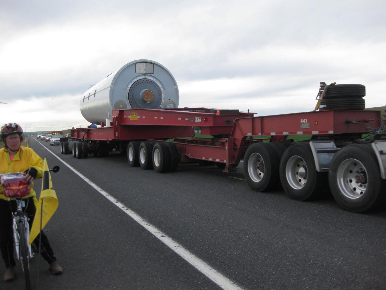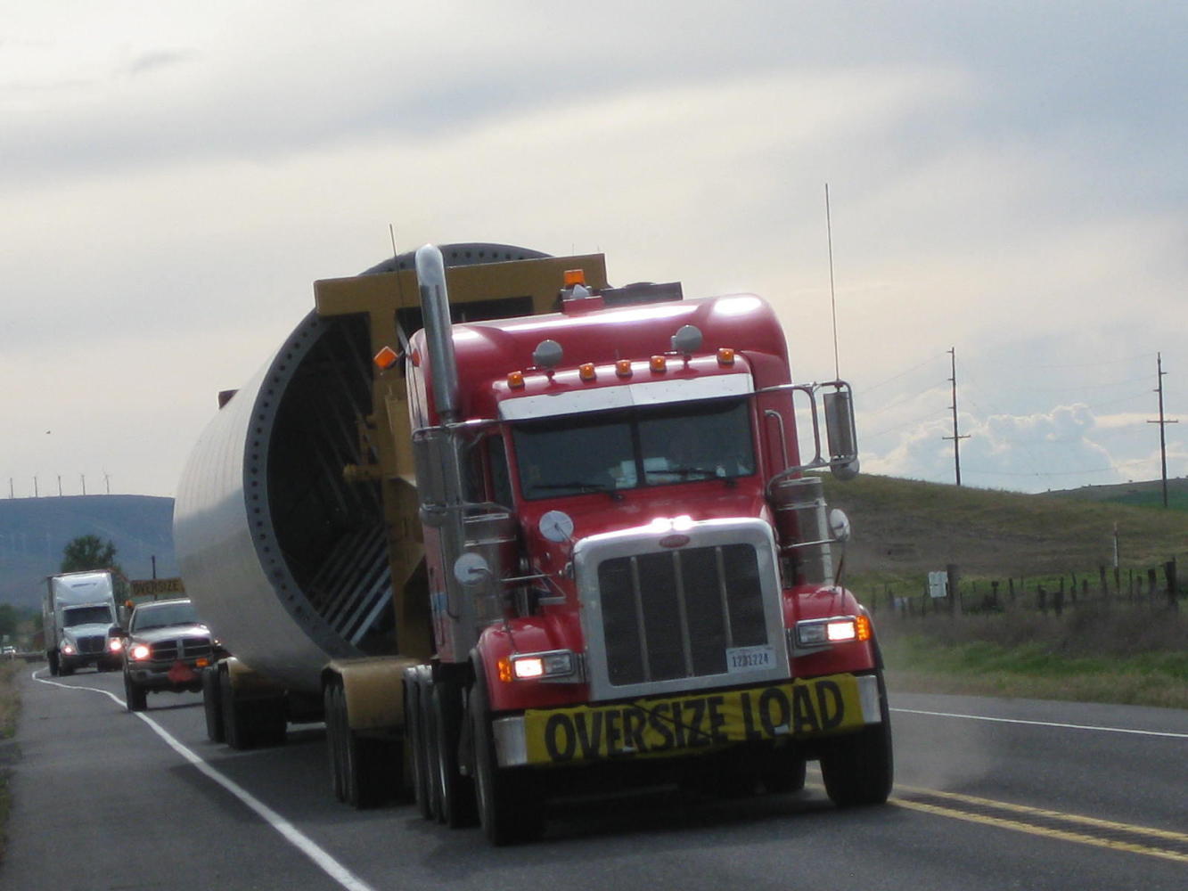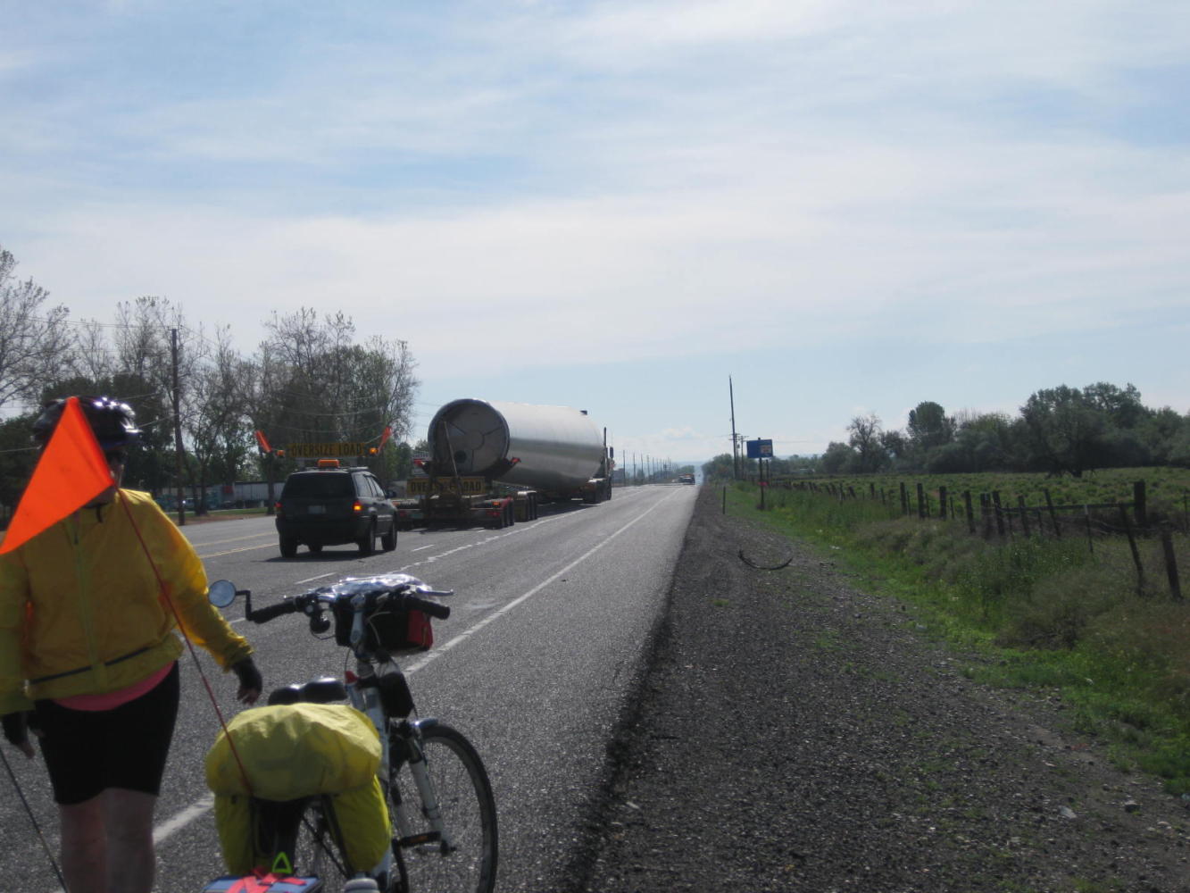 Several times we were passed by processions comprising a lead car, a wide load, a trailing car, and then a pile of regular drivers who had been held up by the wide load. The loads were parts for wind turbines. At first I insisted the white cylinders were parts for "rocket ships", but the long elegantly curved blades are unmistakable. In each case the lead cars beeped repeatedly at us, as if we could cower any further over to the side. Then the semi with the giant part would blow by at full speed, usually with no regard to the effect on us or on approaching drivers. Dodie blasted them with her air horn, but unlike other dogs they seemed unaffected.