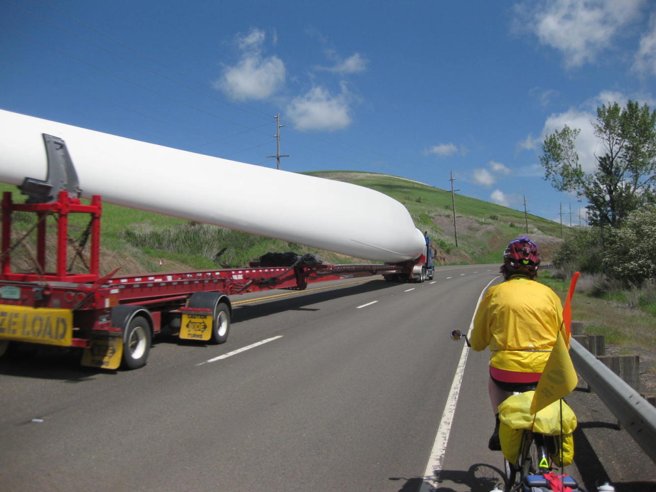 The road proceeded in moderate ups and downs and it settled on the moderate (or not so moderate) up mode. Along this stretch, theree boys on heavily laden bikes beat quickly past us. These were the same fellows who had done the same thing near Wallula. They were not very communicative, sparing us only a brief "Hi". But we recognized them because one was using square white plastic buckets as front panniers.