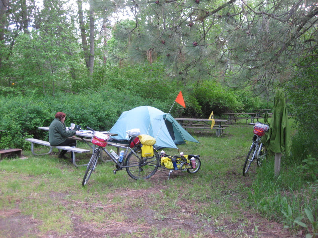 Our luck held, as very quickly we came to Lewis an Clark State Park, with camping sites right there and not up a hill either! Best of all, they had "primitive" campsites, where cars are not permitted. Some of our best camping experiences have been at such sites, in PEI long ago, and at the Icefields Campground in Jasper. This one was right beside the very fast moving Touchet River, and also featured many birds, and long needle pines. It also featured no one else around!