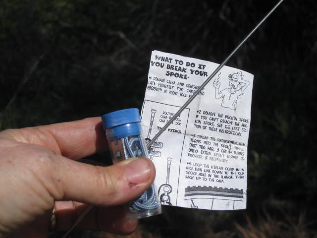 Before leaving we made a conscious decision not to carry the humongous monkey wrench needed to pull Dodie's freewheel. We did however bring two Fiberfix spokes, which theoretically can keep you going without pulling the freewheel. We scanned the instructions before leaving and figured "we'll study this more when and if we need to". Well, out there on the shadeless hillside, we needed to. The first instruction was "Don't panic", and we found that one of the tougher ones. Also tough was the casual indication that you should pass the kevlar cord through the hole in the hub flange. Especially if there is a (dumb) plastic guard between the freewheel and the spokes, this is well nigh impossible. We tried tweezers, a safety pin, the broken spoke, etc. to try to jam the cord through and around, but no luck. Fiberfix does offer a plan B, and that worked! So after quite a time of rolling around on the gravel fooling with the thing, we were back in business.