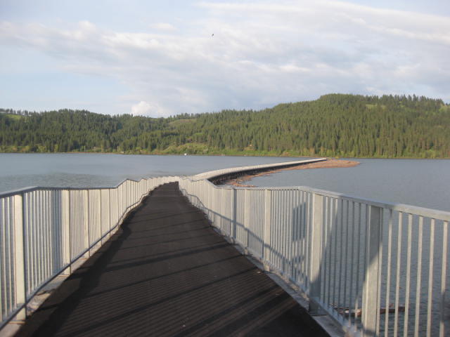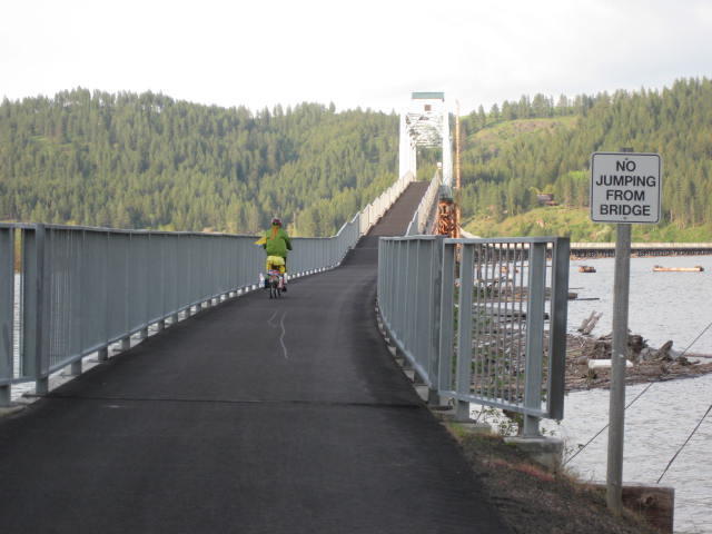 Soon, you come out on the southernmost part of Lake Coeur d'Alene, and in a few km cross to the East side on a unique, large, bicycles only bridge. After cowering across so many shoulderless motor vehicle bridges, this was pure joy. Moreover the bridge roadway proceeds in a series of roller coaster waves, making the coast down the far side again a marketable commodity.