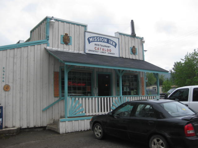 With the unfortunate lack of breakfast at Harrison, we soon began to grumble about not enough strength to carry on. It looked like Smelterville, quite far down the trail would be our first chance to find something that was not crackers and cheese. Just for fun, but without any confidence, I put the question to the GPS. "How about the Mission Inn, in Cataldo" it replied. As veterans of passing Cataldo 100 times on the Interstate, we were sure that there was no restaurant there. But soon enough, the Garmin said "it's 100m away, on the left". And yes, there it was! Plus, they had homemade barley soup, which is jet fuel when put into Dodie!