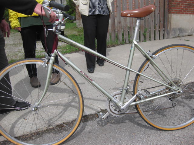 We loaded the bikes onto an open trailer behind the four wheel drive Chevrolet Suburban, but before leaving Harley lead us over to see something special. It was an early birthday present for Nancy, that he had picked up after much searching. He found it in California, on Craigslist. The present was a probably 60's vintage Motobecane Mixte style bike.