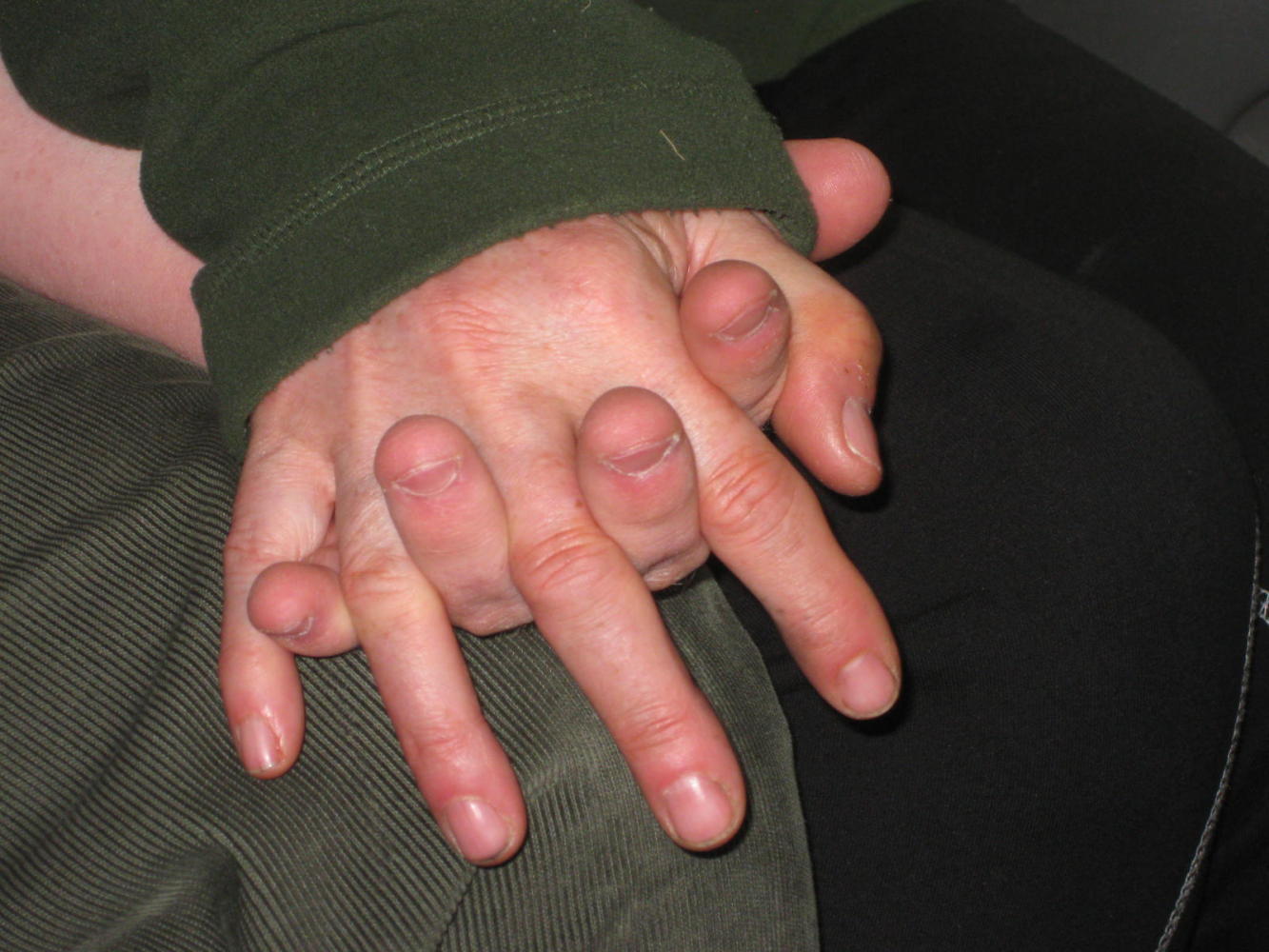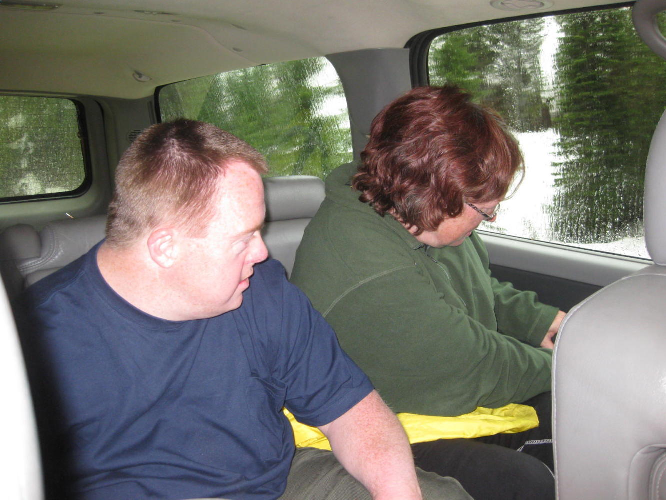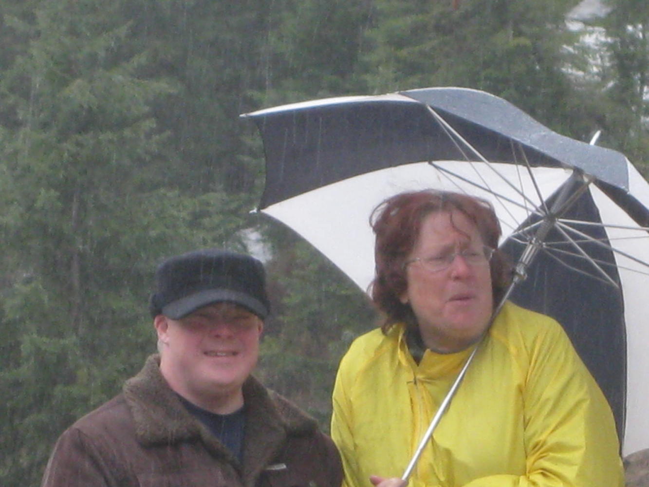 Harley, started to back the rig down, and he is a good trailer jockey. But backing a trailer far down a soggy mountain road is really not on. (Did I mention that it was now pouring?) Looking back past the back seat and out at the trailer, I noticed Nancy and Dodie holding Peder's hands. I assumed that since he was the "kid", they were comforting him. No such thing, both Dodie and Nancy were terrified. Peder, however, styles himself the squeeze tool. He was unperturbed.