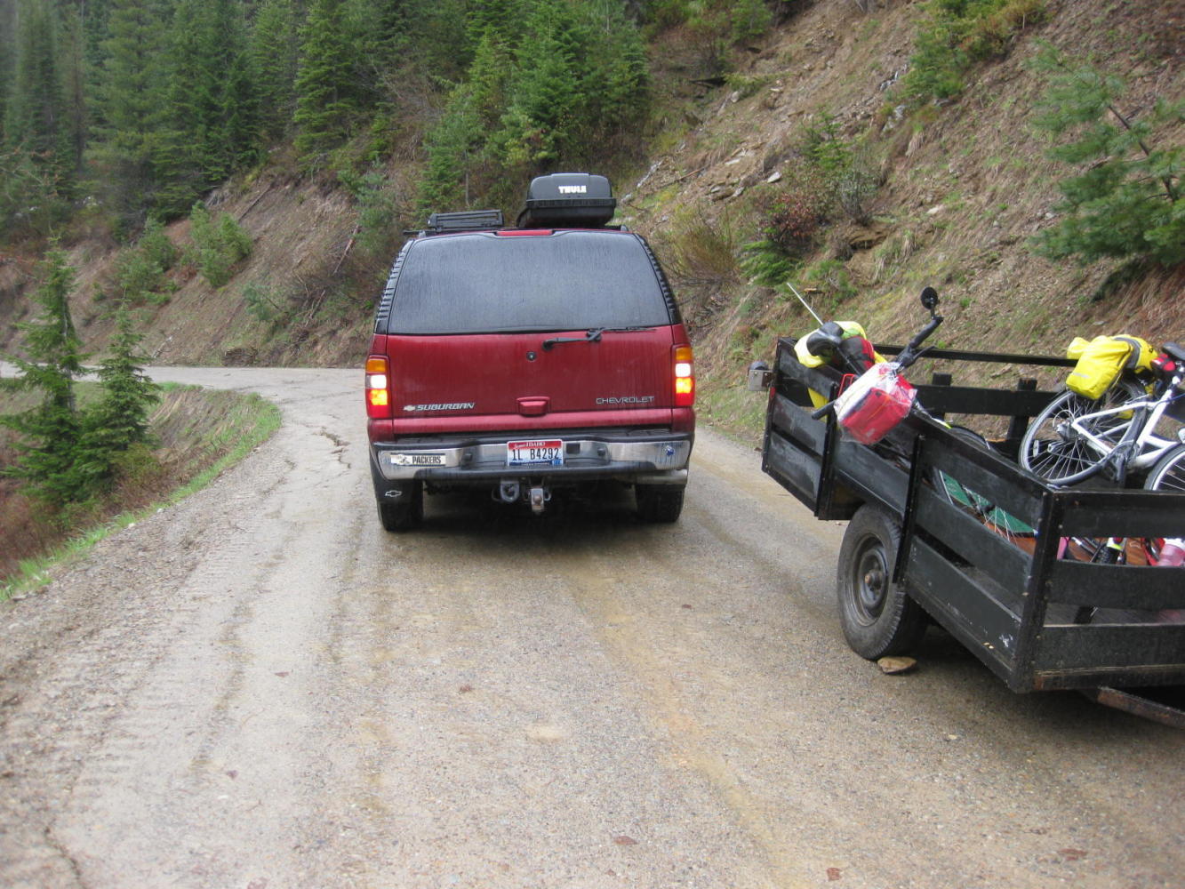 So the "rats" left the ship - no use having everybody roll into the ravine. Then we disconnected the trailer and edged the Suburban down past it. The clearance was 1/8 ", honestly. When the Surburban was down a bit further, Harley turned it around with much backing and forthing and crew members calling the distances to the abyss. We then reconnected the trailer and escaped down the mountain.