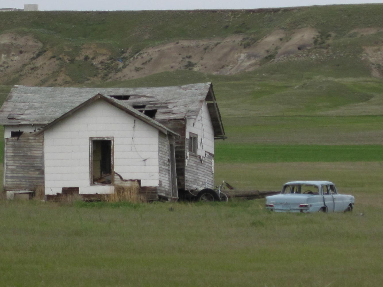 Unfortunately, at the top of the escarpement nature unveiled a new challenge: A stiff, actually - very stiff, northeast wind. This dead on headwind made it a struggle to almost move forward at all. Any downhills were still "uphill". Feeling weak as she was, Dodie still fought on, but slowly. Hours went by, and we were still basically nowhwere. Nowhere in this context means that we had not moved all that far towards our target, Fort Benton. Nowhere also means that around us were no houses, no shelters, no trees. Just stubble fields or newly planted wheat or flooded fields.