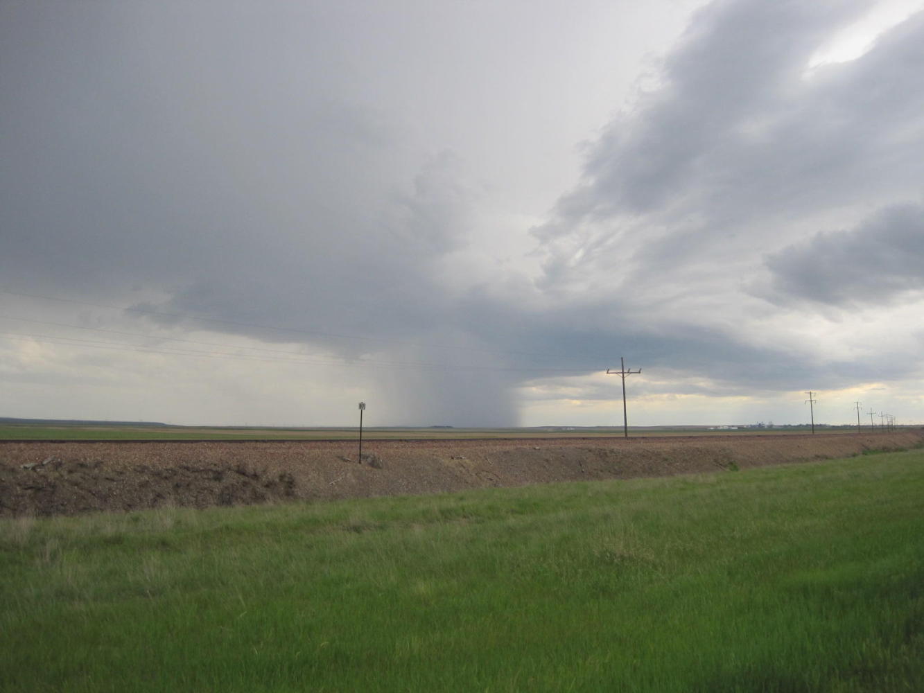 And this did the trick! With me breaking trail Dodie was able to follow. Mostly free of the wind, the flat road became mostly flat for her again. What's more, the thunderstorms, which we could see on either side of us, constrained themselves to some thundering, and never did try to drench us.