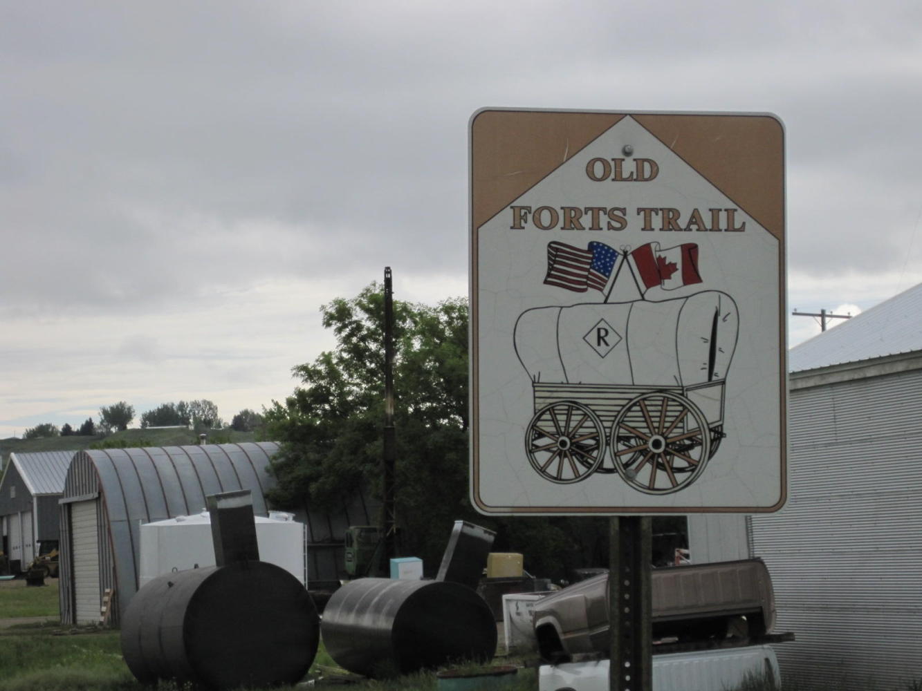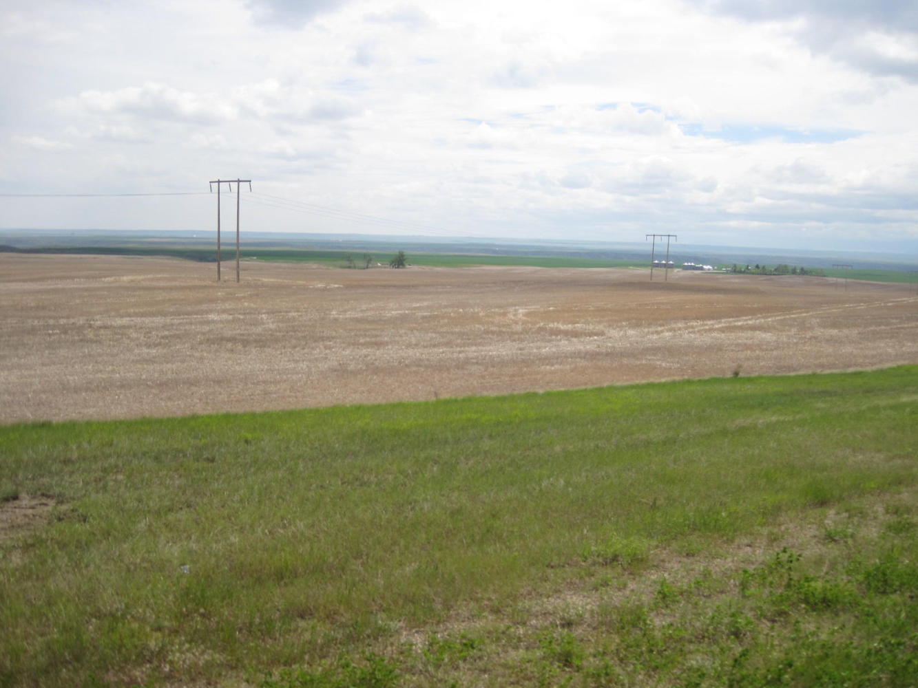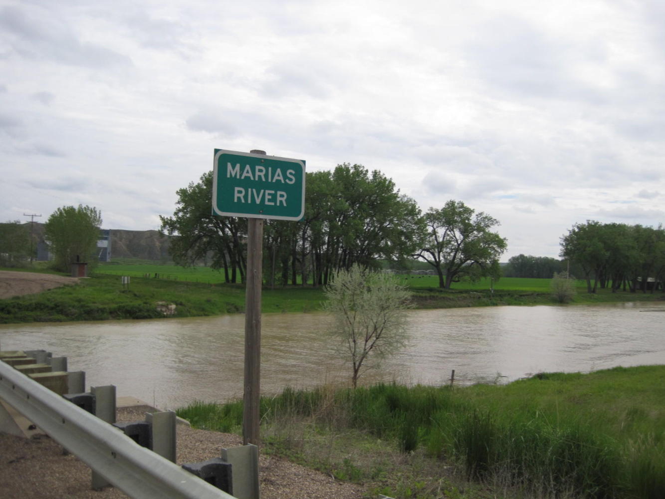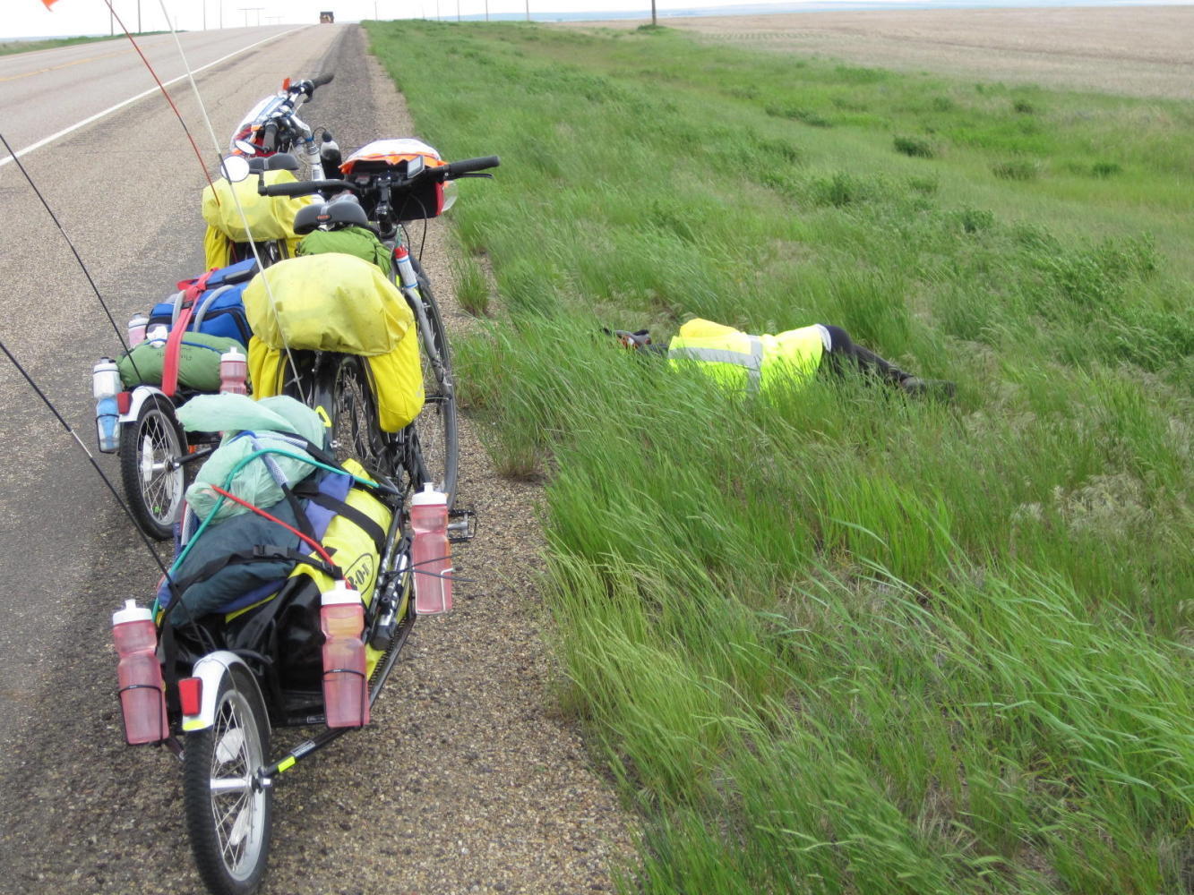 After some hours of this a farmer in a pickup truck stopped to see how we were doing. He offered the fun info that recently the wind had blown from this perverse direction for seven straight days. He said it does that when storms are coming, and informed us that it was already raining in Great Falls. He offered us his driveway as a place to rest, three mile ahead, and suggested we take it, since Big Sandy, our destination, was 20 miles (36 km) beyond that.