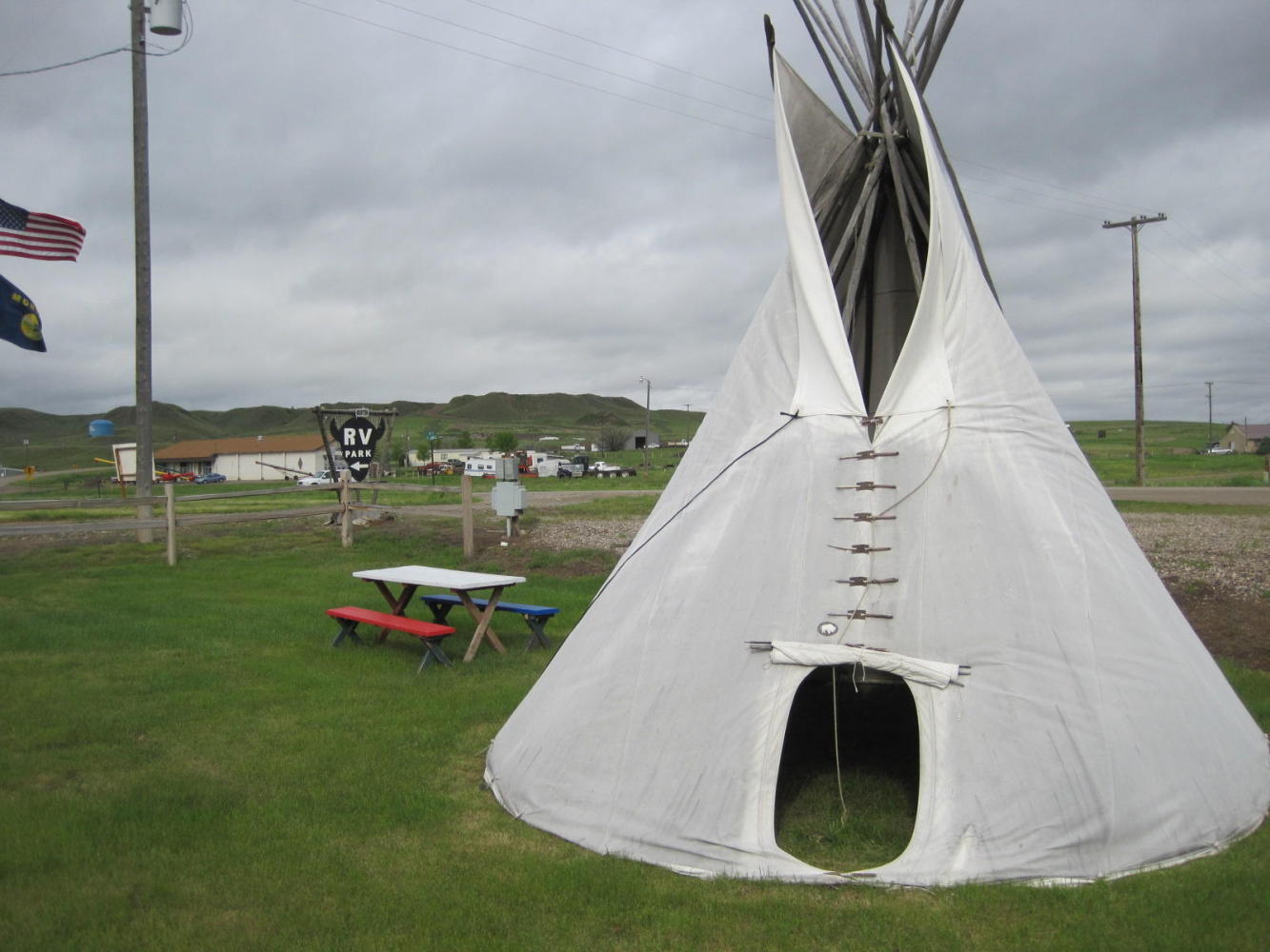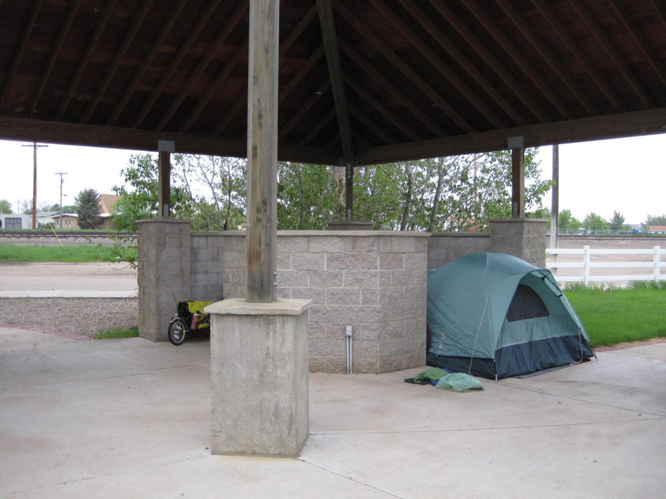 One strange touch to main street is a Wells Fargo bank, in a pristine building that would look fine on Bay Street, Toronto. Also the coffee shop, the Bears Paw - named after the nearby mountains - looks pretty good. We will find out more about this town tomorrow morning. Right now, our stealth camp is actually pretty high class being covered and with a good picnic table. There is no internet (no cell signal, no accessible wifi) to keep us up, and of course you readers can not be with us now either, so it's lights out and tomorrow will be another day!