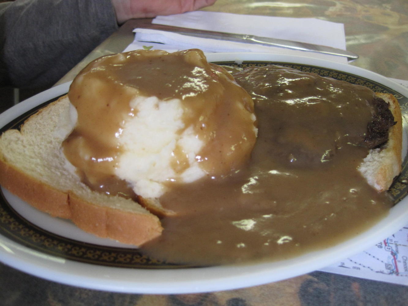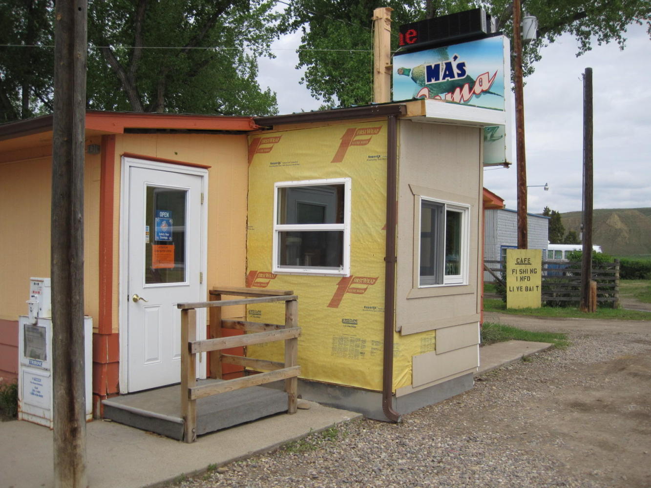 I was interested in a coffee, because I knew I had that excellent bran muffin stashed, but Dodie correctly pointed out it was our only chance for lunch. So we took a seat in Ma's Loma Café. The place inside looked normal and I guess it was normal, with the usual selection of burgers and sandwiches.