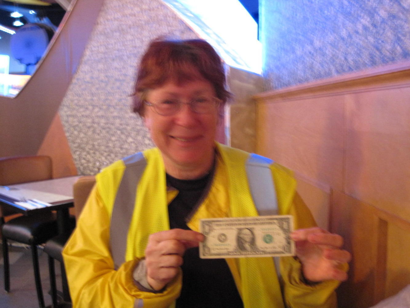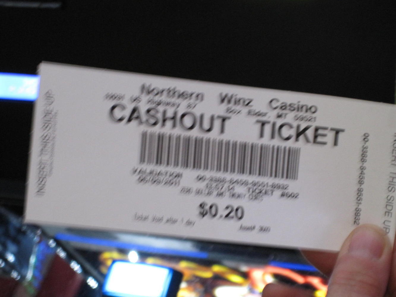 Finally Dodie sat down at one and put her dollar in it. She pressed the "Play" button and something happened, not sure what. One more press and it seemed she had won something! The machine printed out a voucher for 20 cents! We had no idea of what to do with this. Dodie thought that maybe you could put it into another machine, but somehow we failed to figure out where. So we went off and found the manager guy. He had us take the voucher to the cashier, and Dodie received two shiny dimes. A winner!