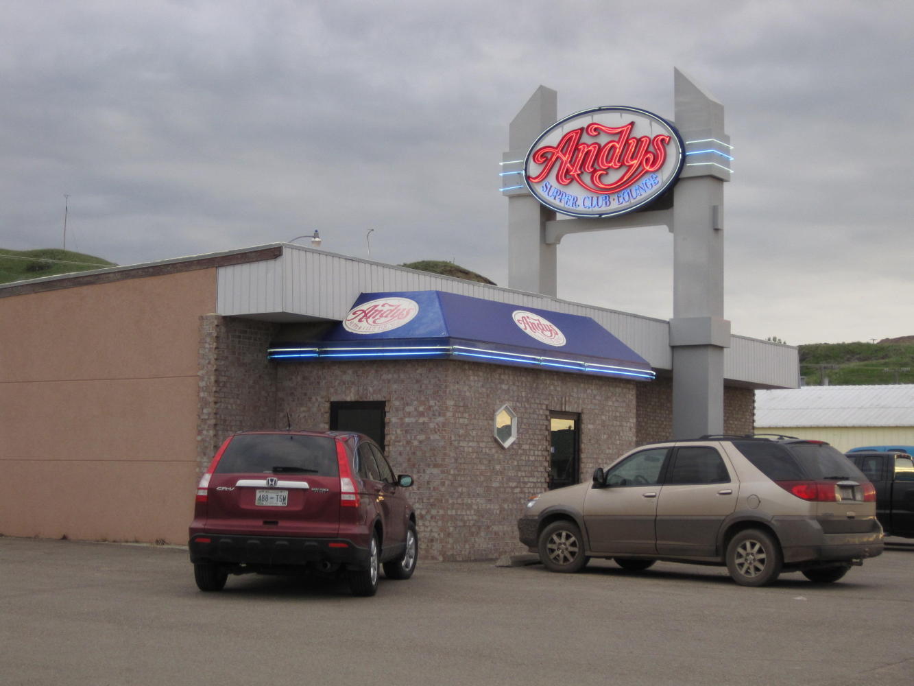 In a gas station we ask after "Joes" for which we had seen a billboard a few towns back. A customer overhears and recommends "Andy's", so that's where we head. Andy's, too, is styled a lounge and Casino (Casino!), ut thge sign also says "Supper Club". Inside is a room with dark paneling and white table cloths. The menu is a bit of a shock, because the price of a steak is about $26, or twice what we are used to. We say what the hell, and anyway the price is for a complete meal.