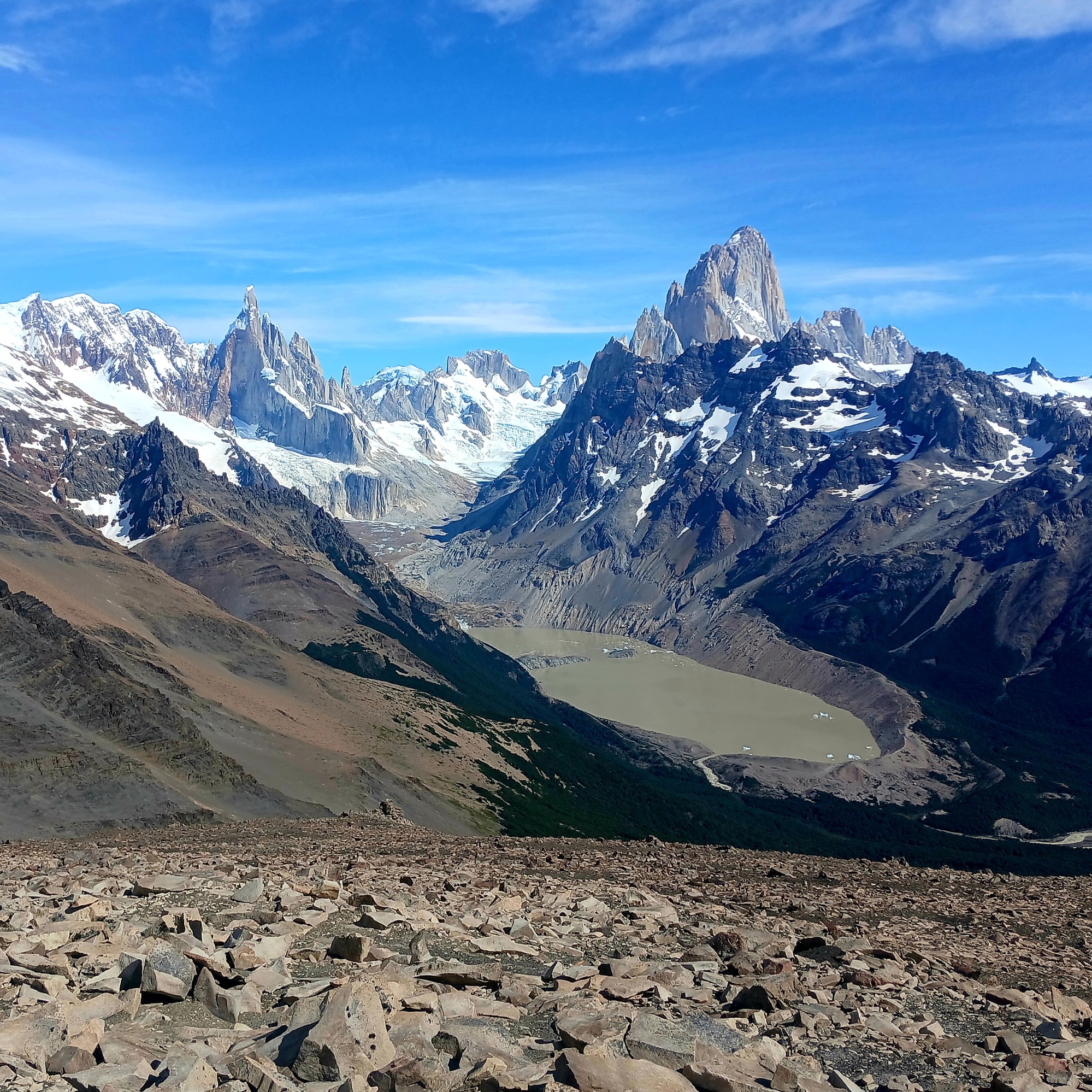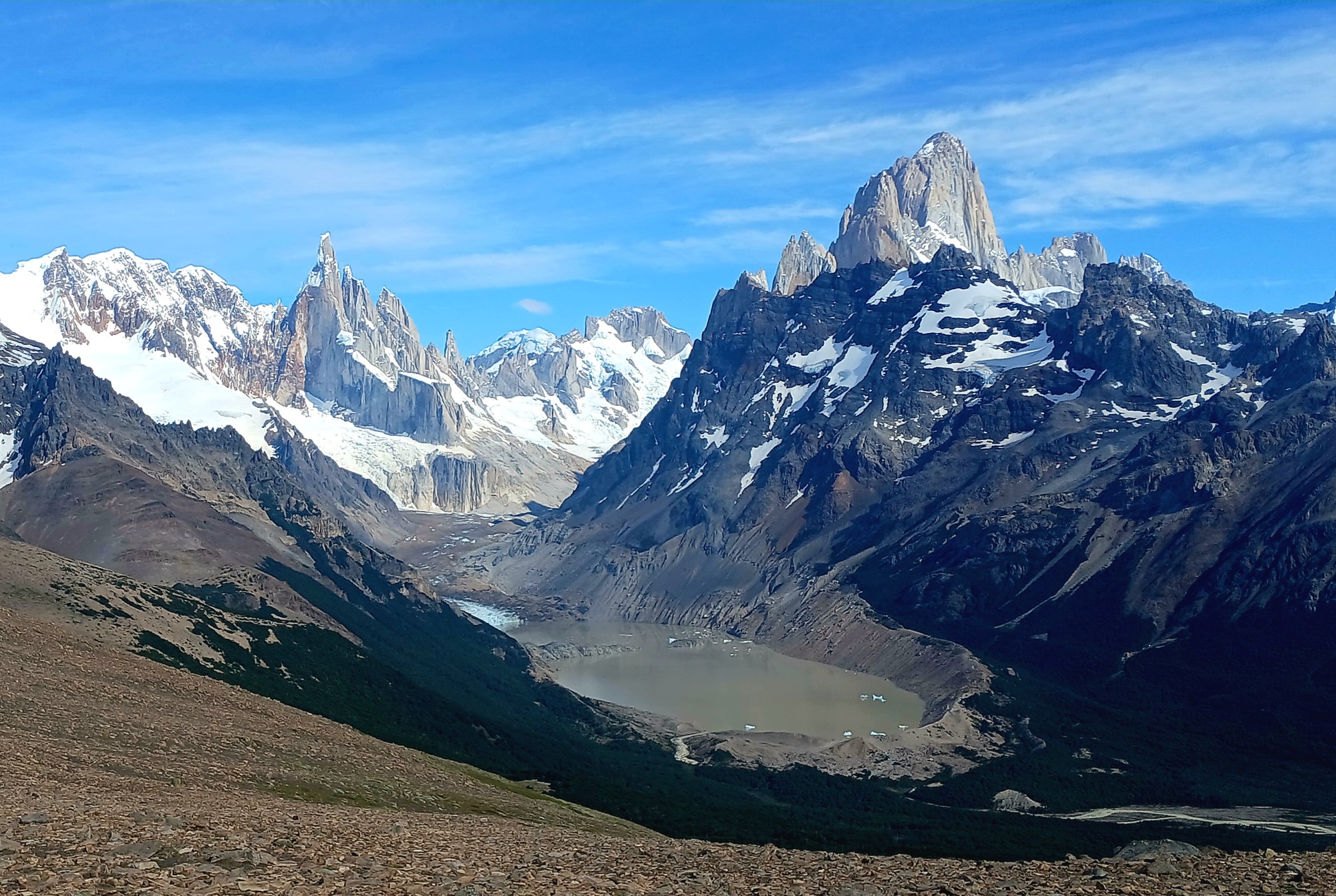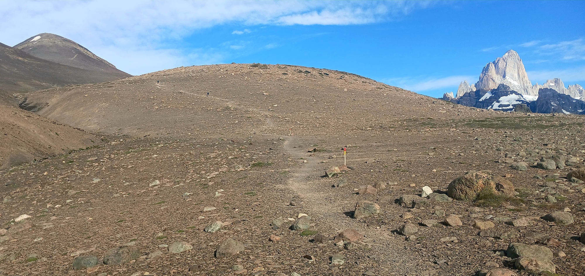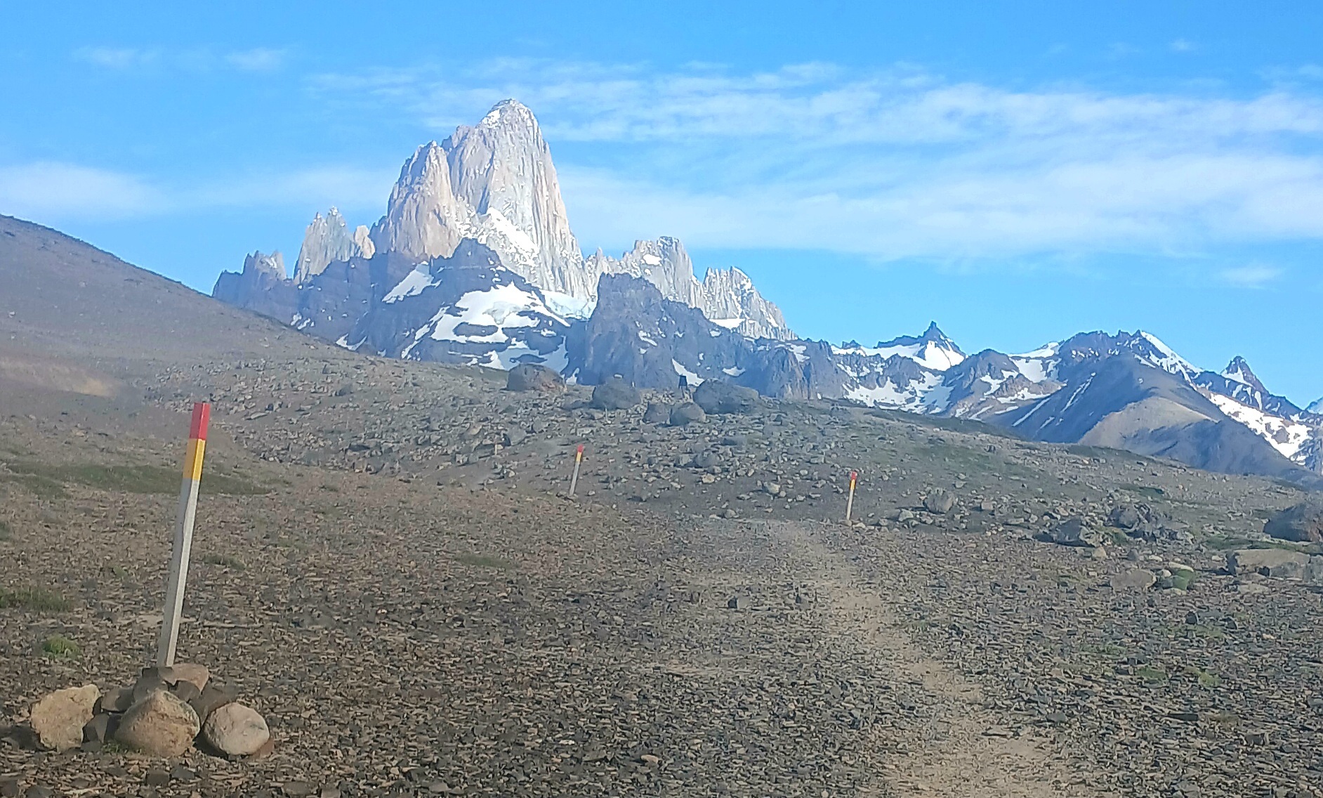 At 4 kilometres there is a split in the trail with the way going right across more pasture then uphill through woodland emerging out upon shorter sparser pasture and a few hundred metres on, most of the vegetation peterers out altogether; ahead is a traverse of barren bare rock and stones with wooden stakes at intervals marking the trail. Off to the left is a towering hill with the trail visible zig-zagging its way up the steep slope. Though for the time being the trail continues up a low hill at a right-angle to the latter climb, toward Fitzroy and Cerro Torres with the other peaks of the range towering over the line of the hilltop, vivid grey rock spires against clear blue sky. Over the crest the way continues a few hundred metres to a spot looking down upon Laguna Torres where I'd been on cloudy days: today it is good to see Cerro Torres, the lower slopes and massif with tablular tops; the glacier in a valley between it and foot of Fitzroy.
