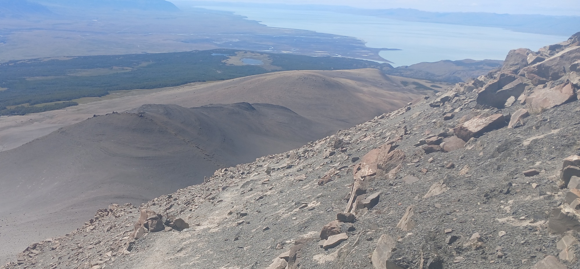 It is extremely steep and I'm thinking it'll be scary coming back down what with being almost on hands and knees in parts scrambling up over loose stones. But eventually the top is reached. The French family sat atop a stone pile and the group taking self-timed group photos. The view even more spectacular with a vista down into the valley to the south wherein the Tunel river flows down to Lago Viedma and looking west up the valley toward a glacier and the Southern Icefield.