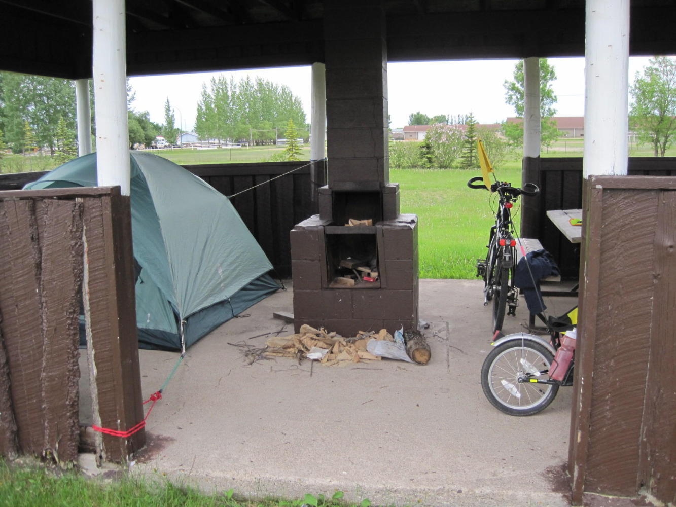 Our spirits then took a huge leap, for there was Juul, waving to us from the door of the Log Cabin. The Log Cabin is the town's welcome mat for visitors and particularly cyclists. There is fresh Saskatoon berry pie, a cyclist's guest log, maps, plus abundant camping spots, showers, and a covered shelter! Plus, wifi!