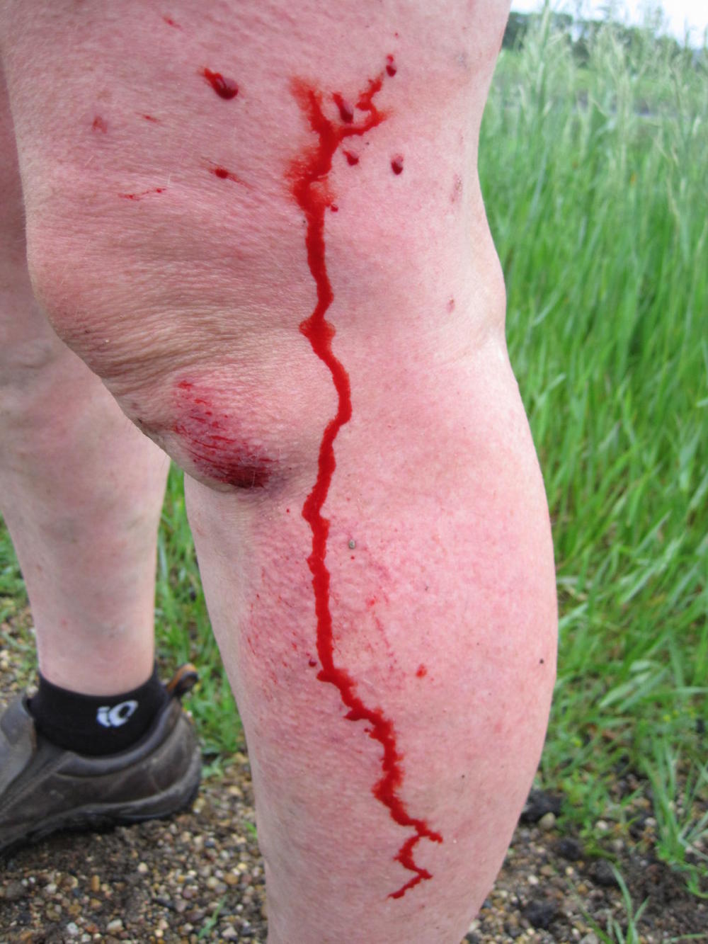 I put my bike across the road to stop traffic and tried to find out where Dodie's injuries might be. She felt her shoulder was broken, and I and some people who immediately stopped could not lift her to her feet by any handy parts. Eventually she was able to get up by herself and stagger to the side of the road. It took some time for her to not feel like fainting and to straighten out the bike (except for the smashed mirror).