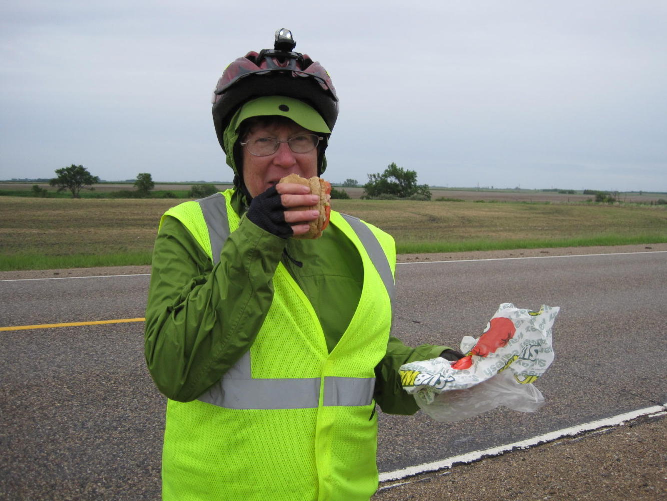 The headwind had swung around to the NE, making it mostly a cross wind. Early on it was also not too strong and so we were making good progress. The road, however, continued with no shoulder, forcing us out to contend with heavy truck traffic, comprising tankers, grain trucks, and livestock trucks.