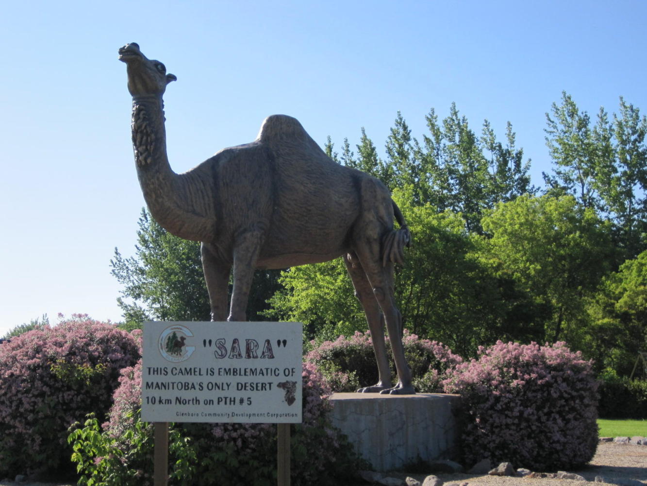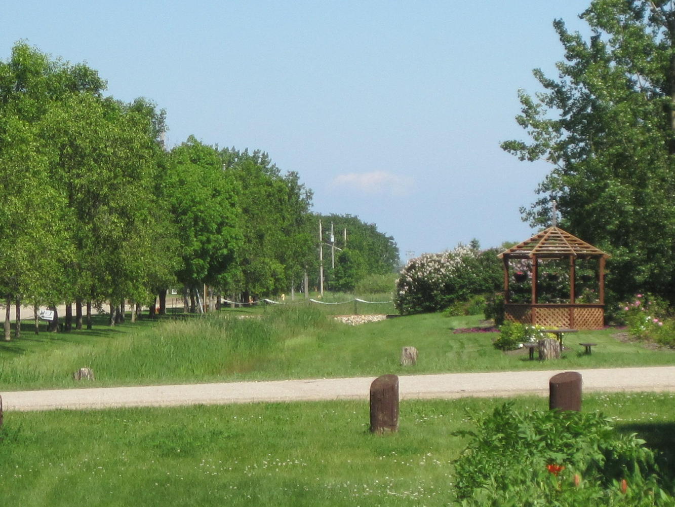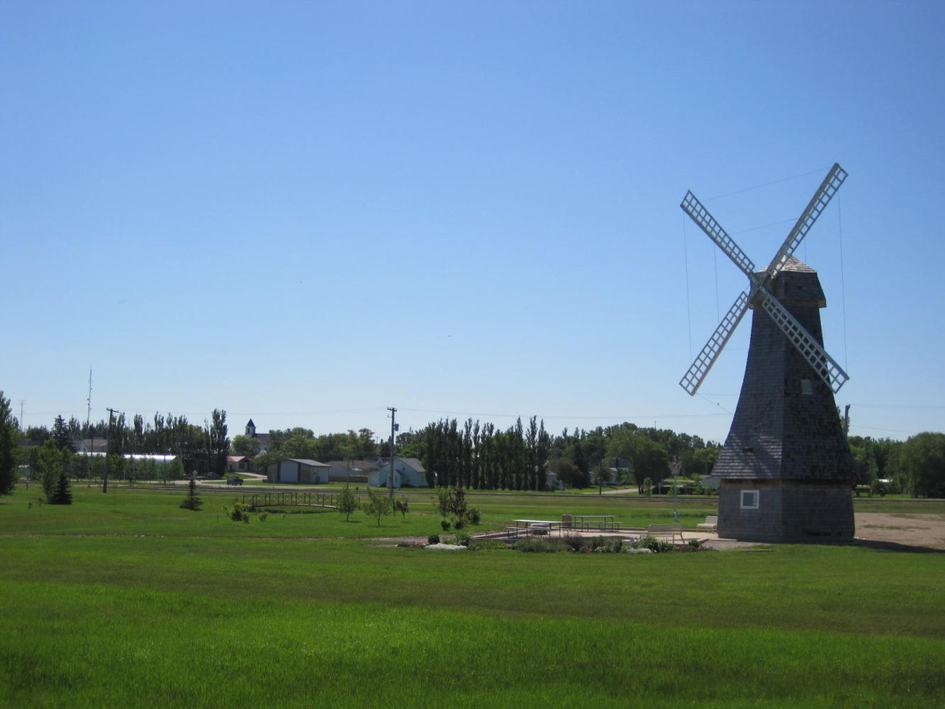 Mayor Norm Carter of St. Claude, Manitoba. (Joni - note the t-shirt). We seem to attract mayors off the street. We talked about the ralaxing nature of small town life, the flooding and seeding situation in surrounding areas, the condition of the road, and the encouraging fact that Norm - an anglophone - was elected in mostly French speaking St. Claude. Norm then invited us to city hall where we received two city pins and got to see the gardens, of which they are very proud.
