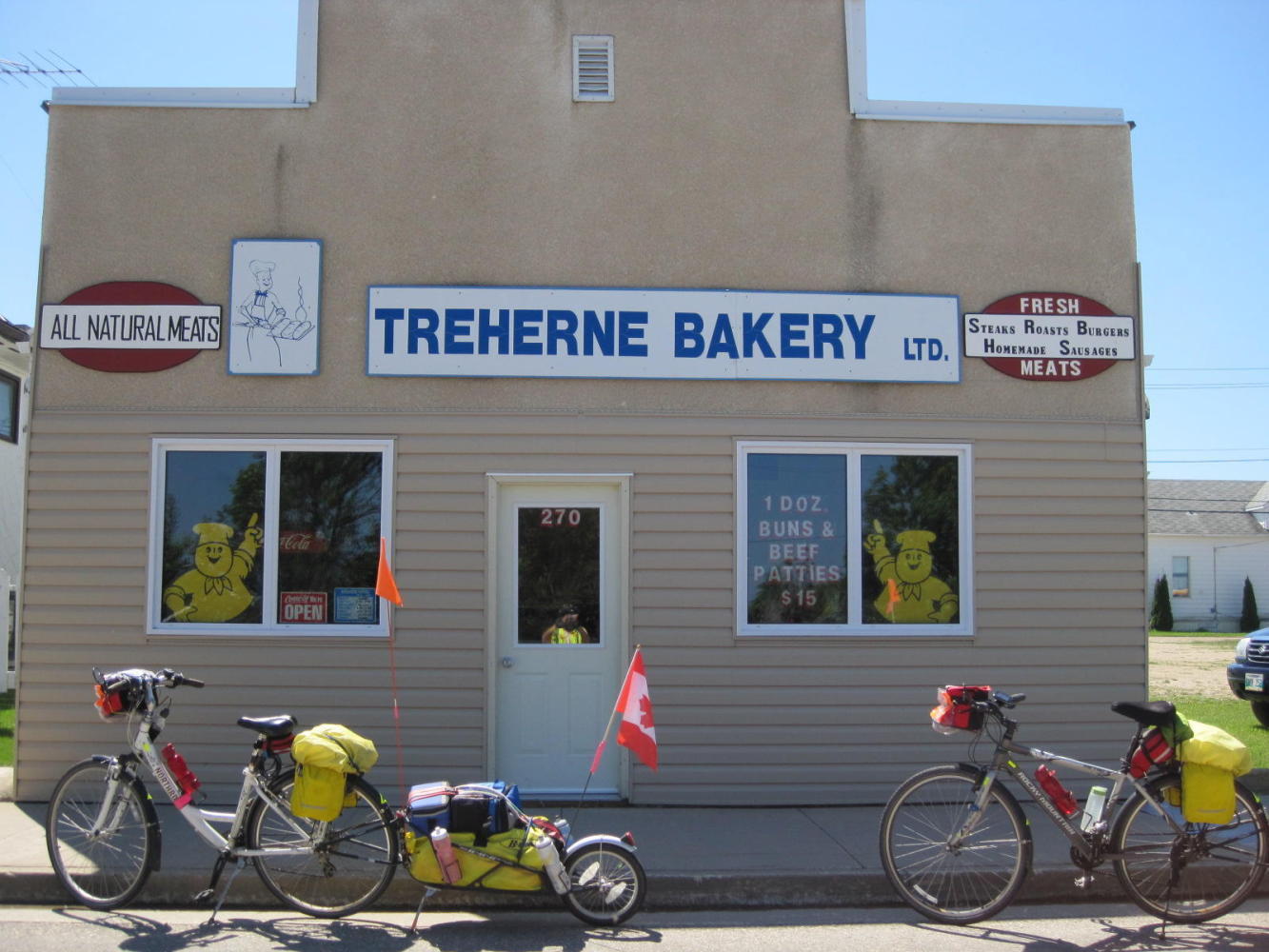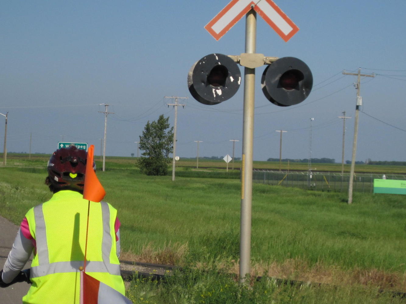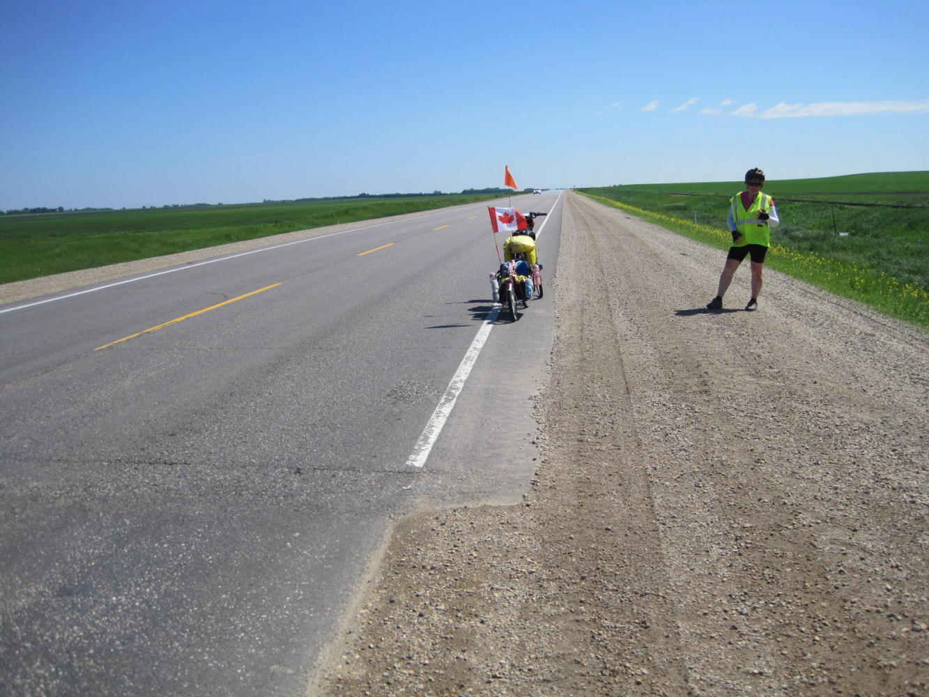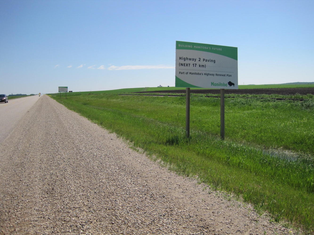 With Dodie's shoulder pretty much non functional, we had set our goal for the day as reaching St. Claude, a distance of 72 km. However, after doing about 50 km with no headwind fairly quickly, we saw a sign that said Winnipeg 117 km. "Hey", we said, "We could do that!".