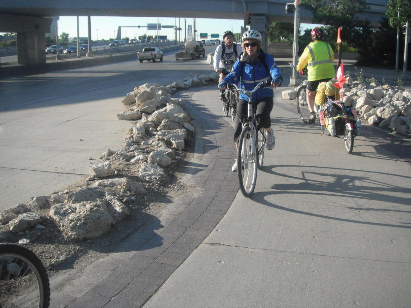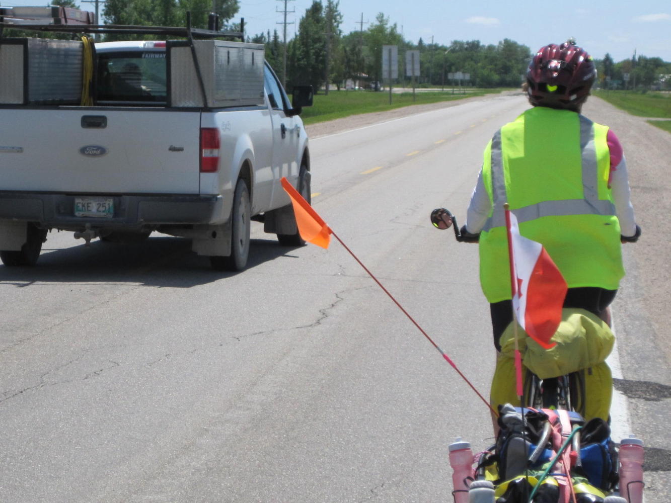 Once out on Highway 59 heading South towards Minnesota, the situation became even worse. The traffic was heavy and of course no shoulder. Trucks and cars repeatedly passed by us too close and too fast. We finally remounted our flags out sideways, giving us at least the illusion of getting more clearance. We also began to study the map to see if there would be a quieter route.