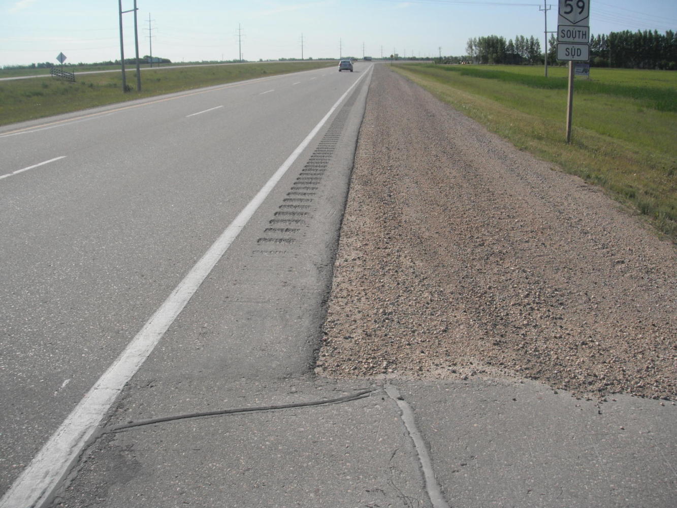 At this point a pickup truck stopped opposite us and 'Peter' came over. Peter had been reading our blog! He lives nearby and said he would never dare ride hwy 59. He recommended we jump to a quieter road at the first opportunity. We agreed, this was nuts. Before we did jump over - just before the town of St. Pierre Jolys - a young woman came over to ask us the UQs. She too said that no one who wanted to live would take a bike onto 59. In Manitoba, there are few alternatives to such deadly roads. Unlike more progressive administrations in Quebec and Prince Edward Island (for example) the Manitoba government clearly cares nothing for cyclists or their safety. We recommend people avoid this place if at all possible.