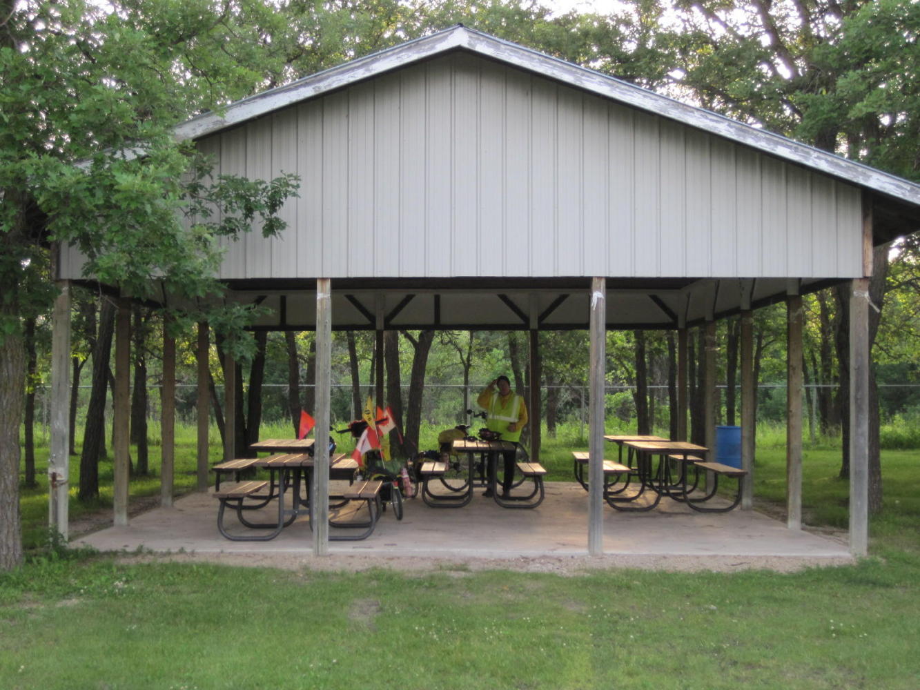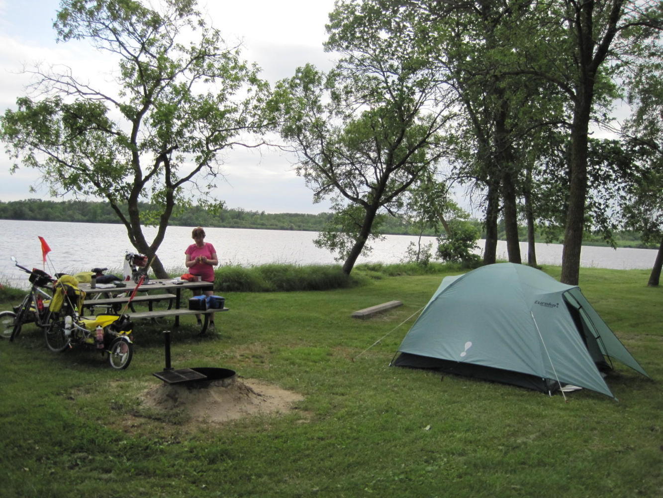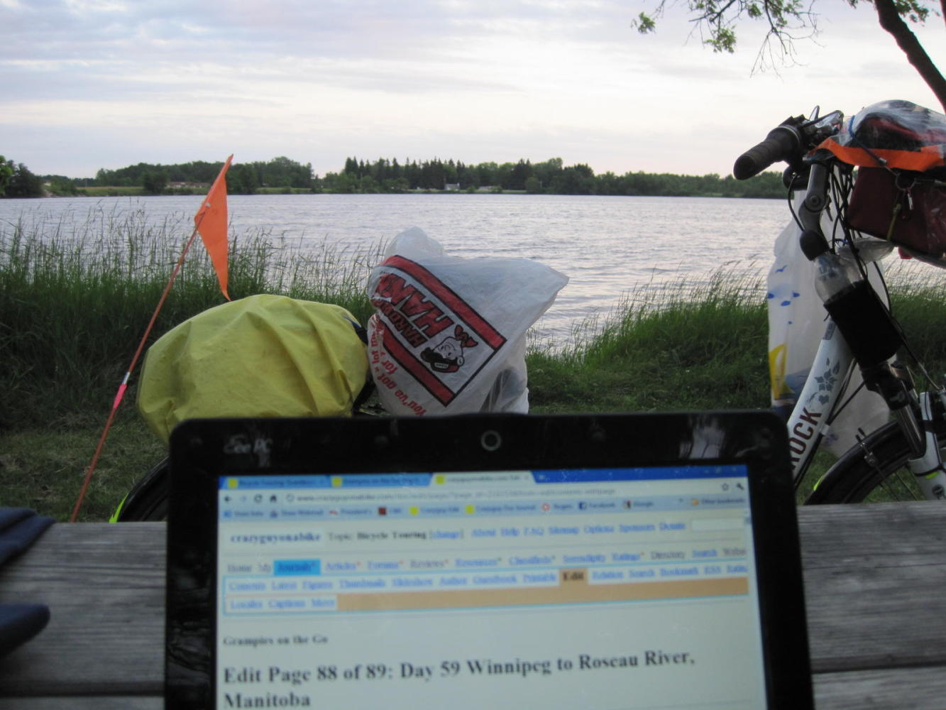 Roseau River Park had some major advantages: covered picnic tables, flush toilets with shower, electricity, no one around. No wifi or cell signals, though.