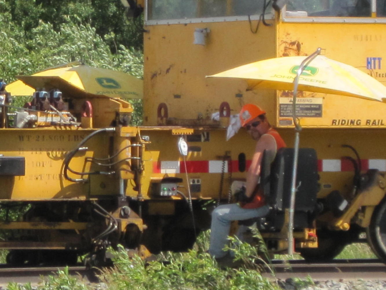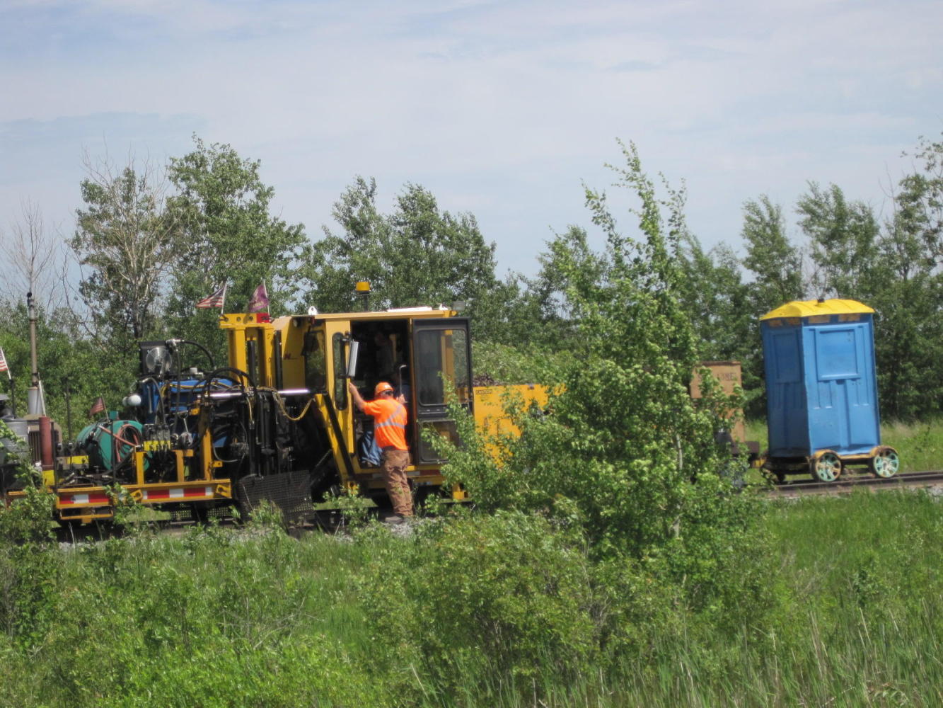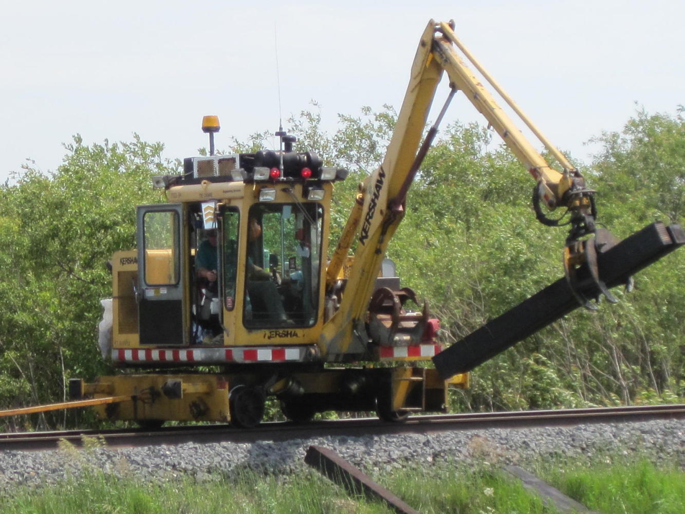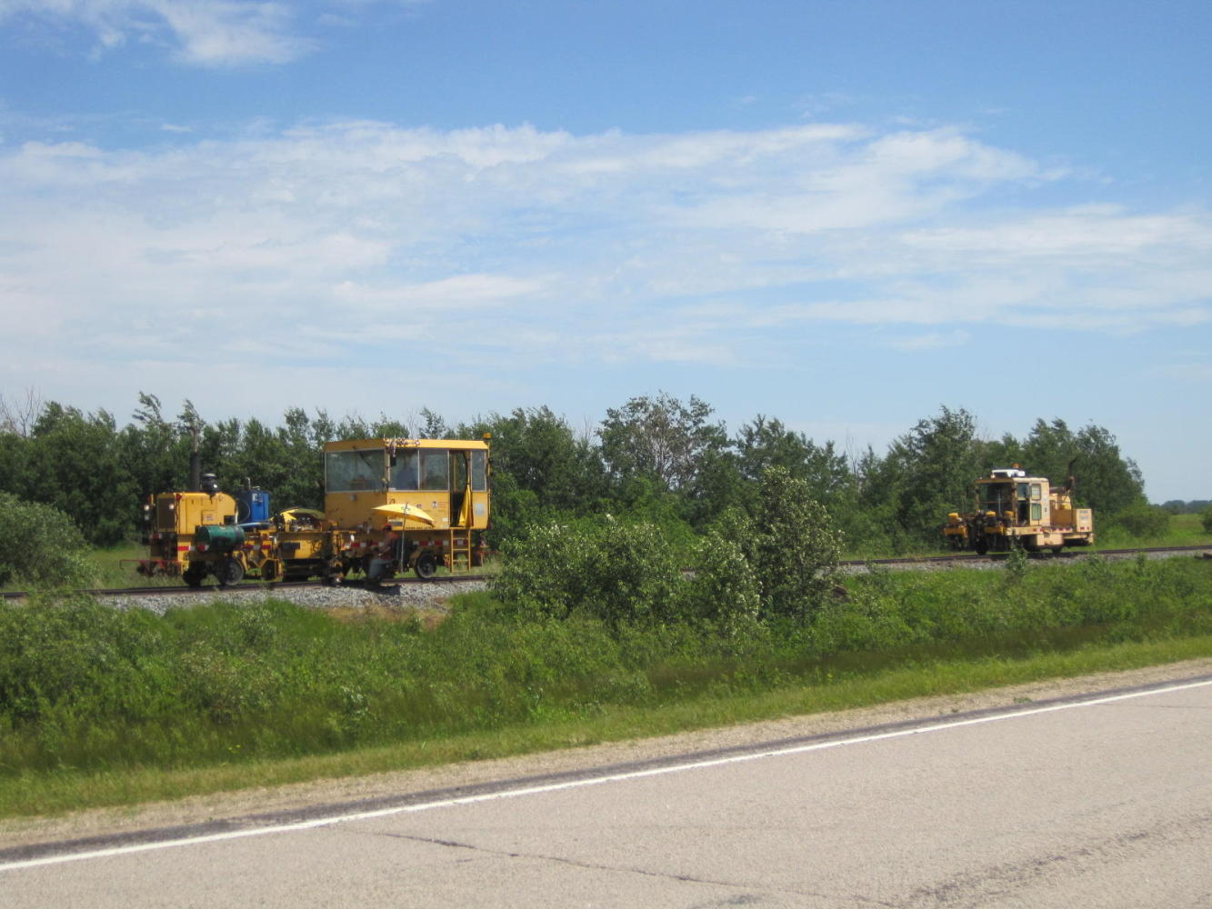 In one stretch, though, our time was enlivened by the presence of a large number of rail workers refurbishing the line that ran beside the highway. Actually, machines did all the lifting and shoving, etc. There were six or seven different types, all travelling on the rails. They pulled up spikes and ties, spread rock, made holes for new ties and shoved them under, stacked the old ties, etc. Our attention was first caught by one that pottered along taking new ties from a wagon it pulled with it and placing them most delicately and fastidiously by the trackside. Of course, a human was at the controls, but the thing seemed to have the personality of Wall-E. And when the trolley was empty, it toddled off down the tracks, no doubt humming to itself.