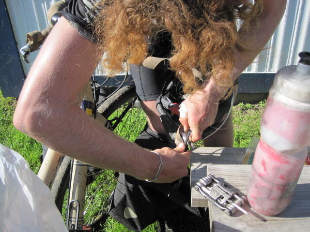 The Big Winnie general store and campground gave us a better surprise, though. As we pulled in, Michael Altfield materialized. Michael is the fourth cyclist (or couple) we have run in to. Each time has been a hoot, giving us a boost as we realize we are not alone out here, and going over the oh so familiar variations of equipment, problems, and strategies.