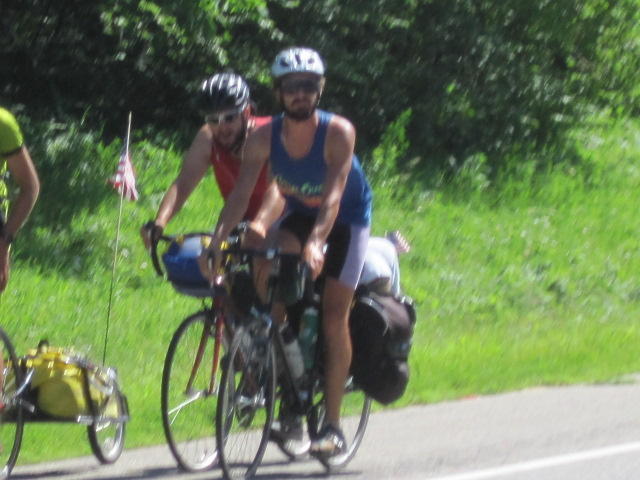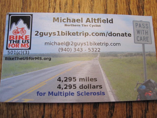 Michael started in Maine and is headed to Seattle. He is young and strong, but we were glad to be able to give him a small boost: Michael's right side bar shifter was falling out, and we had just the size (length) of hex wrench for it. We also had some electrician's tape that fixed up the other side. After the usual one hour spent exchanging stories and route advice, we both headed off in our opposite directions. We are now eager to read Michael's blog. You too can check it out, here is the card he gave us: