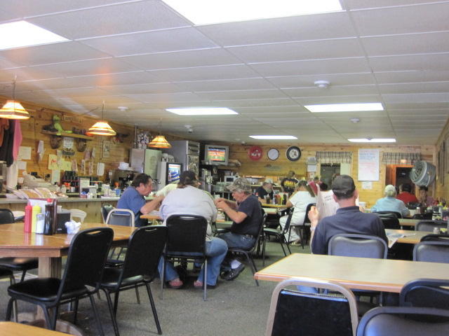 We proceeded instead to the Sportsman's Cafe in town. Speaking of aversions, hamburger and fries and the other such food types are starting to get us down. We expect no relief until Toronto, though. We both ordered club sandwiches. Checking email in the cafe brings word from Yuul, who is about to challenge the north side of Superior, as we sleeze under the south side. Our map shows us few supply points for Yuul and we sure hope his strong cycling skills will bring him through.
