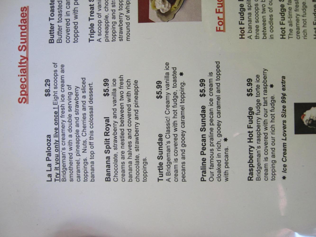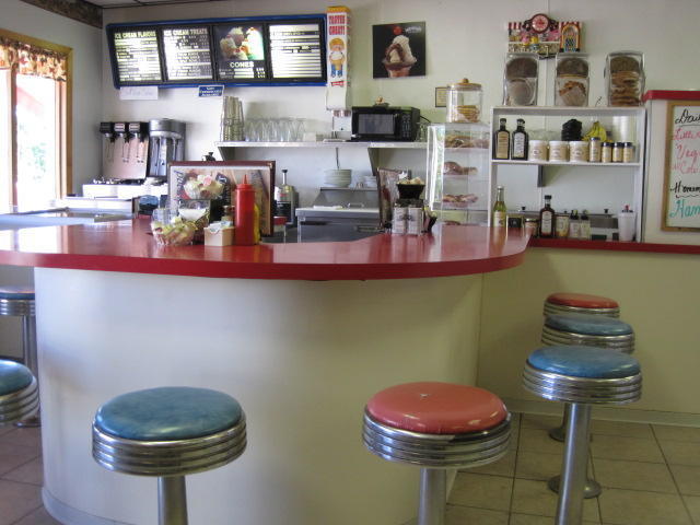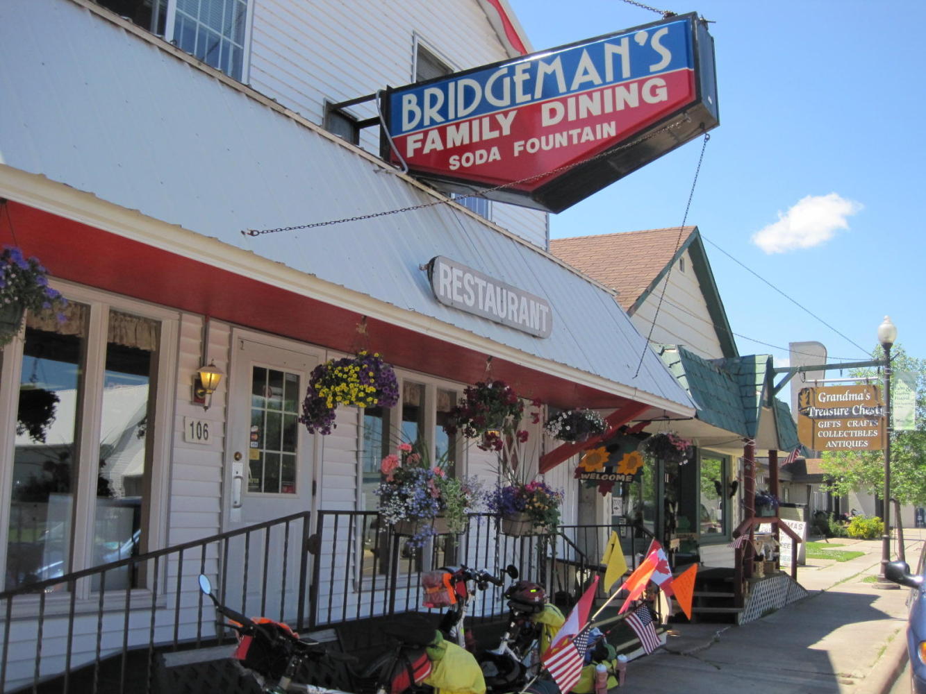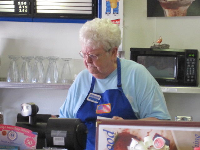 So that is what happened this morning. First we have the dangerously fun like flat road, tailwind, overcast sky with no threat of rain, and wide shoulder. Then after 60 km that we scarcely noticed we arrived at Floodwood by lunchtime. Floodwood has gas stations and stuff along the highway, but we took the turn for the "business district", which is the classic one block long affair. There we stumbled into Bridgeman's Ice Cream, which is 1/2 ice cream parlor and 1/2 restaurant. The place was cool and breezy (fun criterion #2!) and featured not only a waitress (Lorraine) who is everyone's image of "grandma" but also a promise that everything in the place is home made.