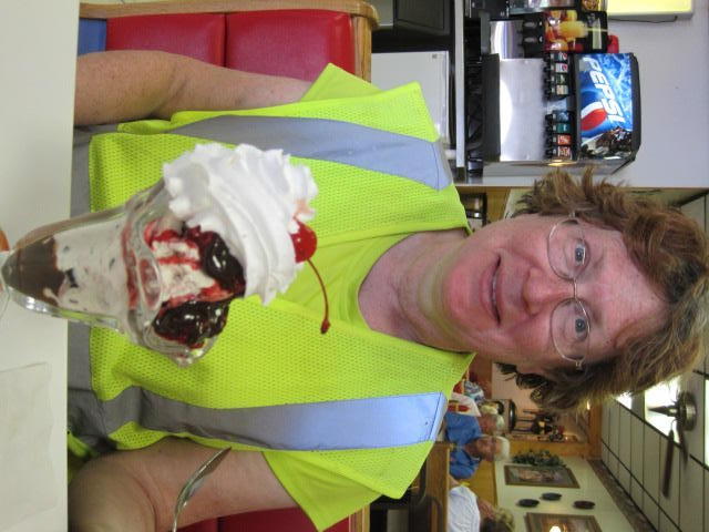 Here Dodie finally got her ideal comfort food meat loaf and (real) mashed potatoes and I got real grilled chicken slices on a real salad. Then, the raspberry hot fudge sundae and the hot fudge banana split. So like I say, this cycling "adventure" has now deteriorated into cycling "fun"! Maybe, with any (bad) luck we will be able to resume this adventure narrative soon!