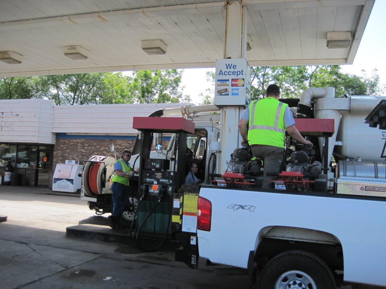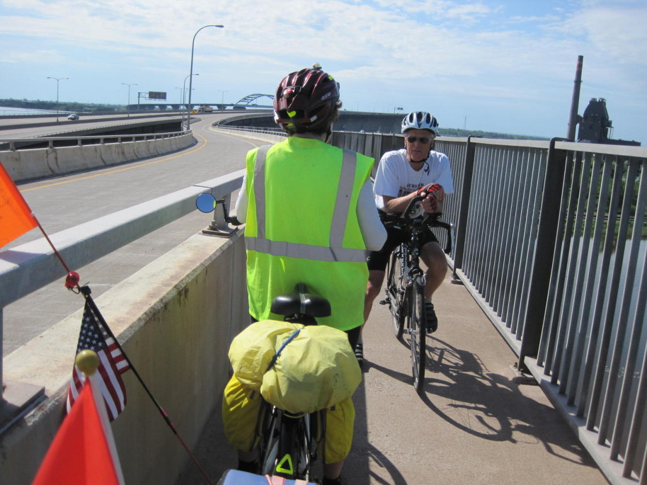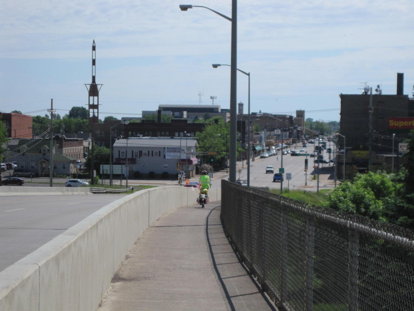 Back on Grand Ave. we approached a category of citizen that we have found very useful in the past: anyone also wearing a High-Vis vest. This time it turned out to be a man driving a city owned power vac truck. He and his buddy came up with the way on to a pedestrian/bike corridor on the bridge.