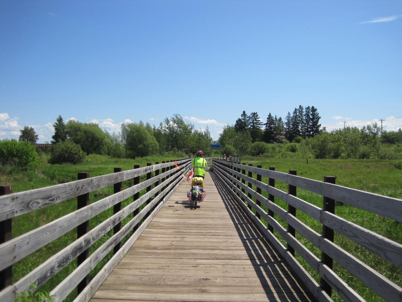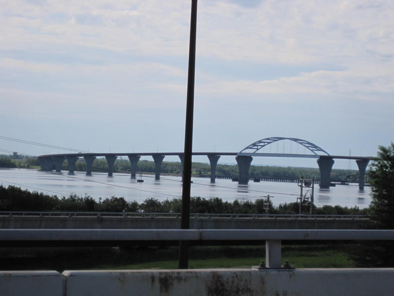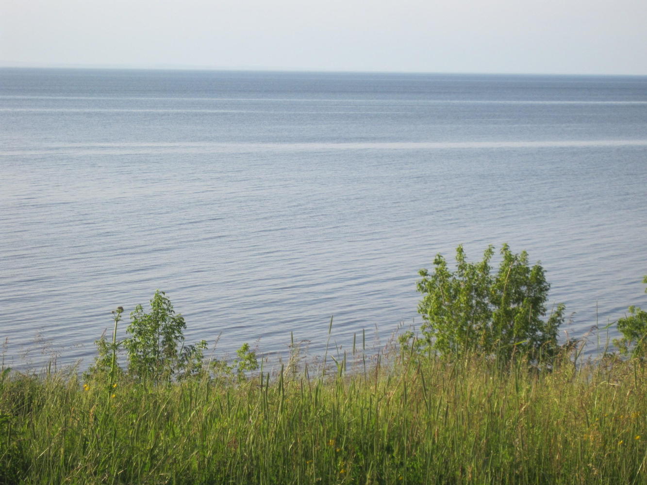 Shortly after the trail ended we shifted to highway 13, the route recommended by Willie, up closer to the Lake. This road was certainly quieter than highway 2. For 20 or 30 km it passed relatively small hay farms, and was pleasant if not spectacular. Its next trick, though, was to cross no fewer than two dozen streams, on their way to the big lake. Each stream featured a ravine and each ravine featured (naturally enough) a down and an up part! On the down, Dodie was afraid of too much speed. On the up, it was granny gear crank crank. Dodie was not impressed!