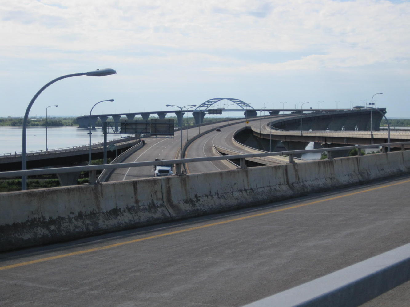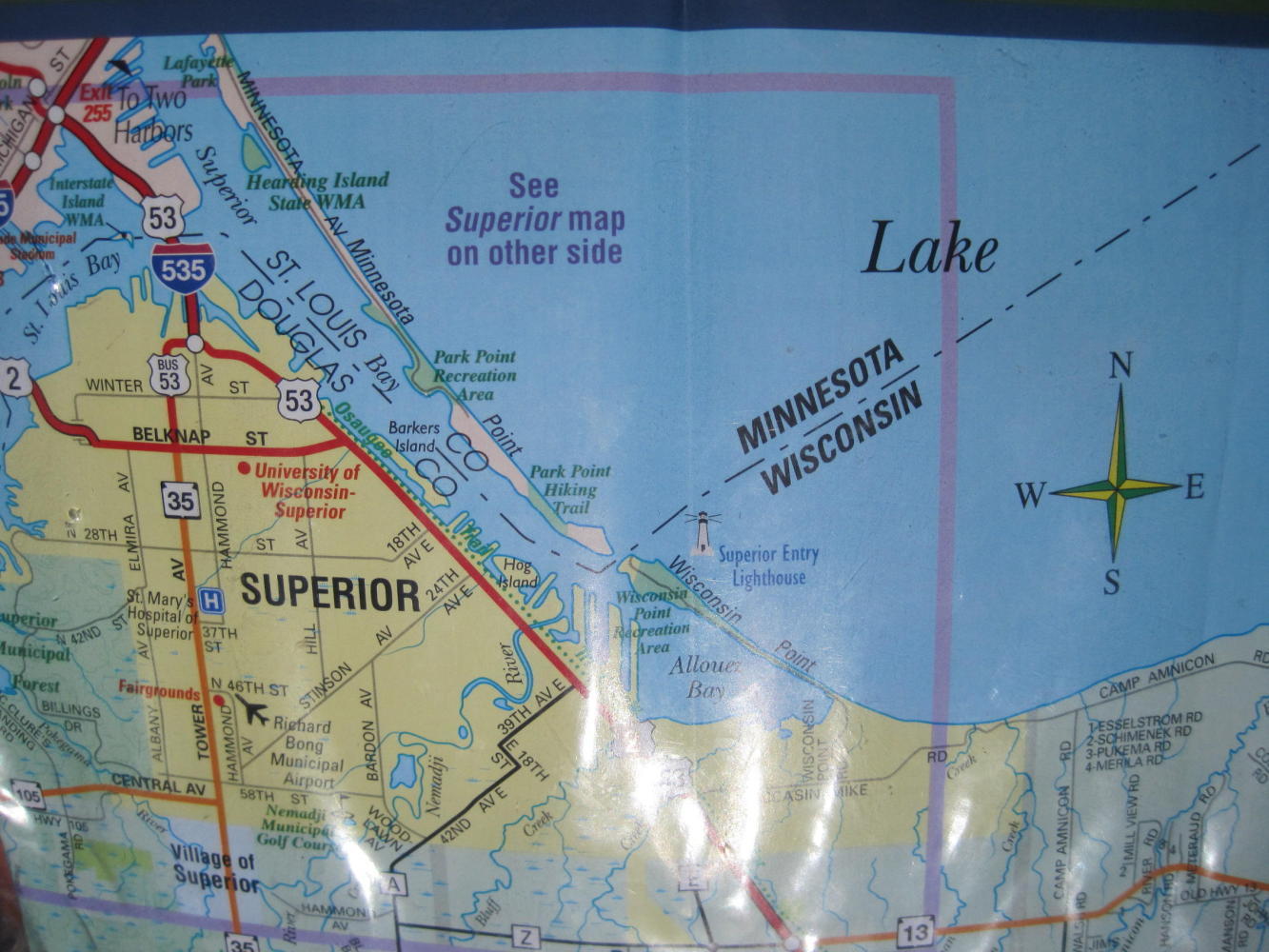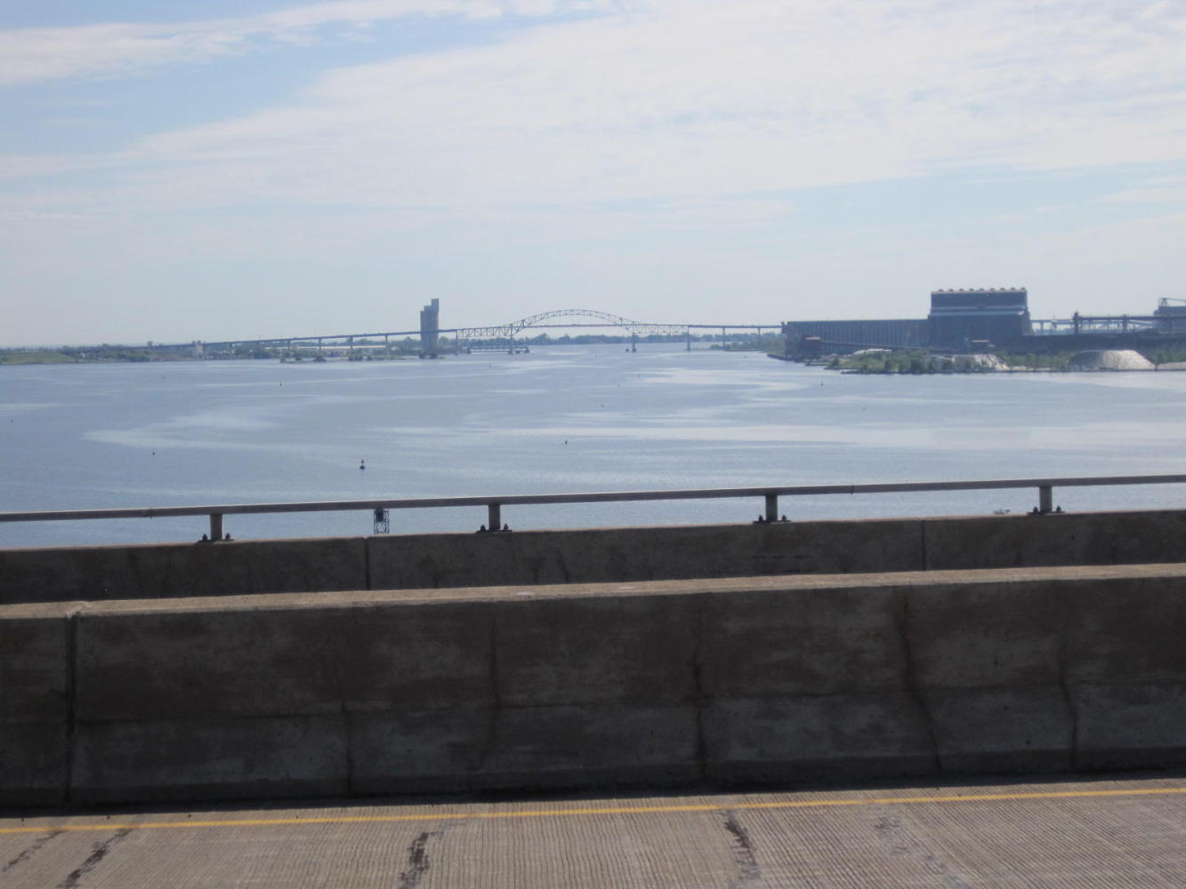 Now for getting out of Duluth. A simple matter of crossing the Bong bridge, to Superior Wisconsin. (Bridge is named for George Bong, a WWII flying ace). Only, not so simple. Our first approach was via the on ramp (duh!). After a bit, though there was a shoulder, there was a sign prohibiting bicycles (plus pedestrians, ATVs, and most any other conveyance). Dodie said 'we have to turn back.' I thought 'We can make it', then I thought 'What would Laurie say (a) if we did make it and (b) if we did not', so we turned back.