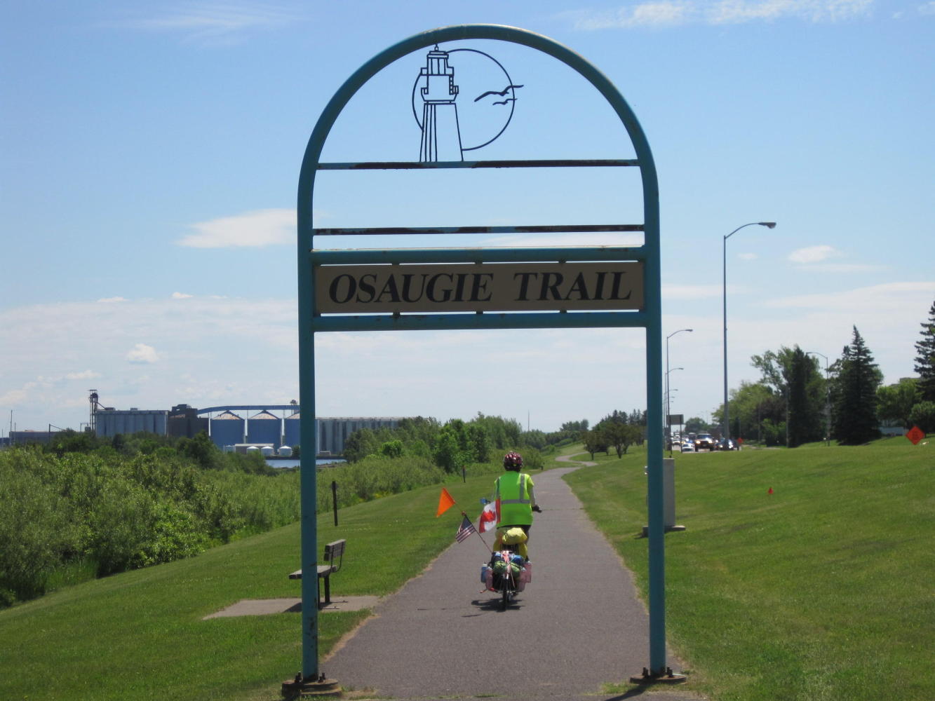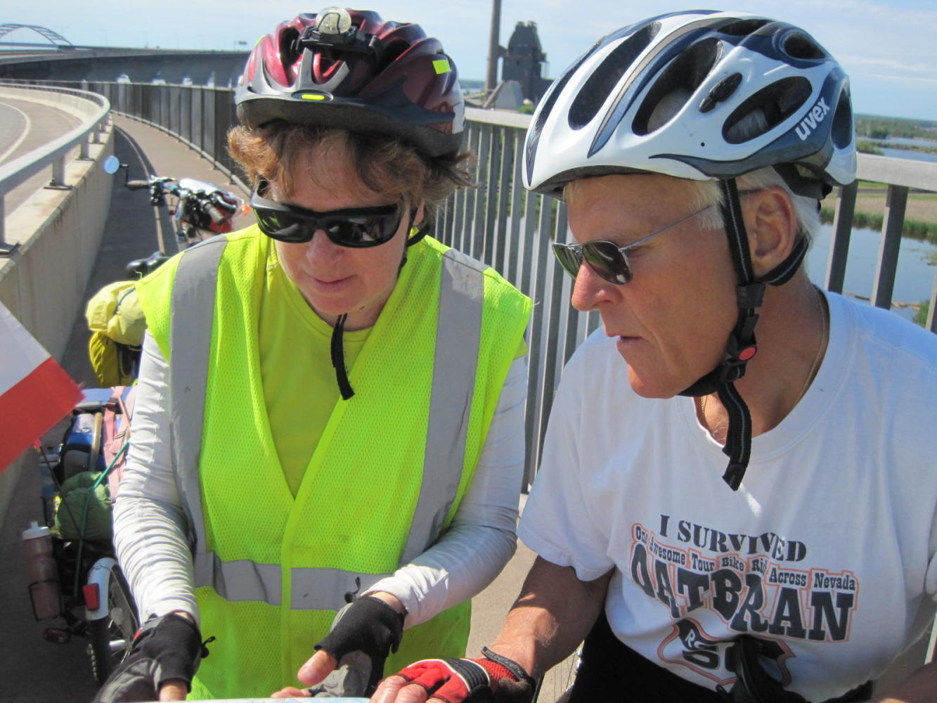 So up we went. Up, up, up. Soon another cyclist approached from the other direction. It was Willie Howard, the owner of 'Continental Ski and Bike' in Duluth, on his way to work. A fairly quick exchange of UQs ensued. Willie said he often saw cyclists stranded out in traffic on the main portion of the bridge, having not found the secret bike corridor. He also listened to our proposed route for the day and recommended we leave highway 2 and follow 13 up closer to the Lake.