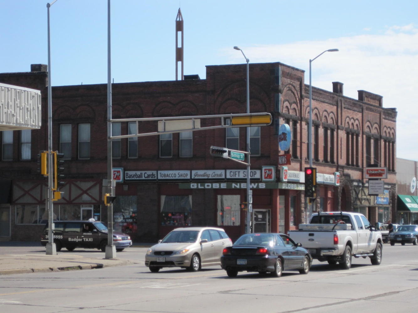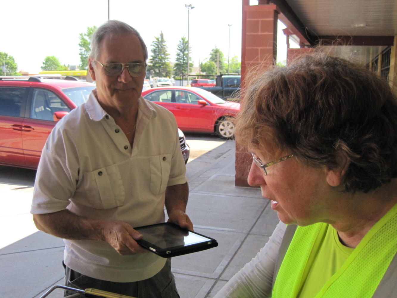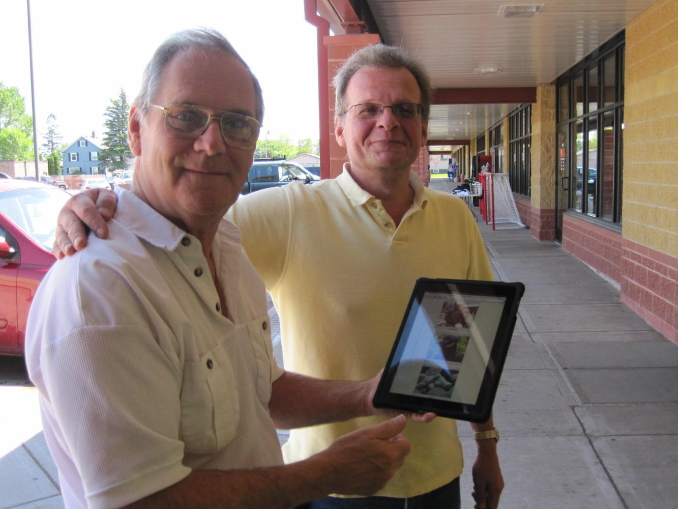 Next stop was a grocery store, the Super One, in a small mall. We parked the bikes in the shade near a liquor store. When we came back, the man from the liquor store already knew a lot about us. He had read the 'Google Us' that we have on our flag, and had been reading the blog. The man was actually Tim Jaques, the owner of the mall. Many UQs ensued. Art Petri, the bartender in the bar part of the store (Belknap Bar and Liquor Store) and also the treasurer of Duluth Public Access Community Television also came out for a chat. Art had his iPad and was looking at 'Mordor' right then. We hoped both would keep reading along - need to keep that hit count up!