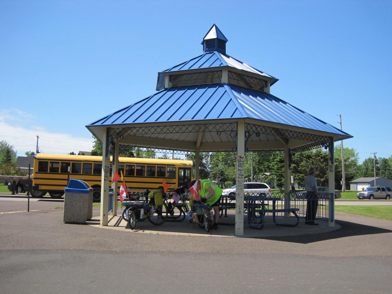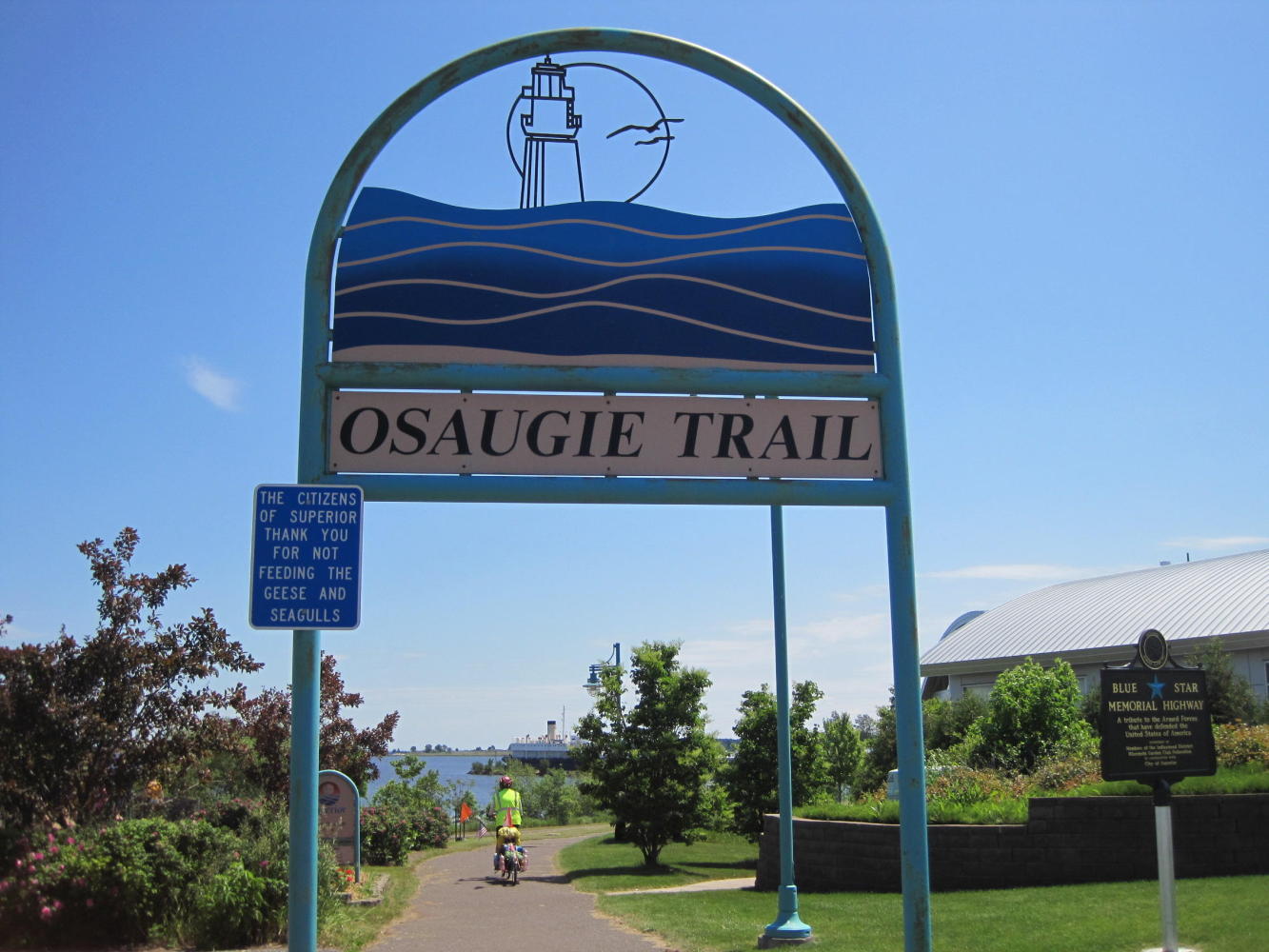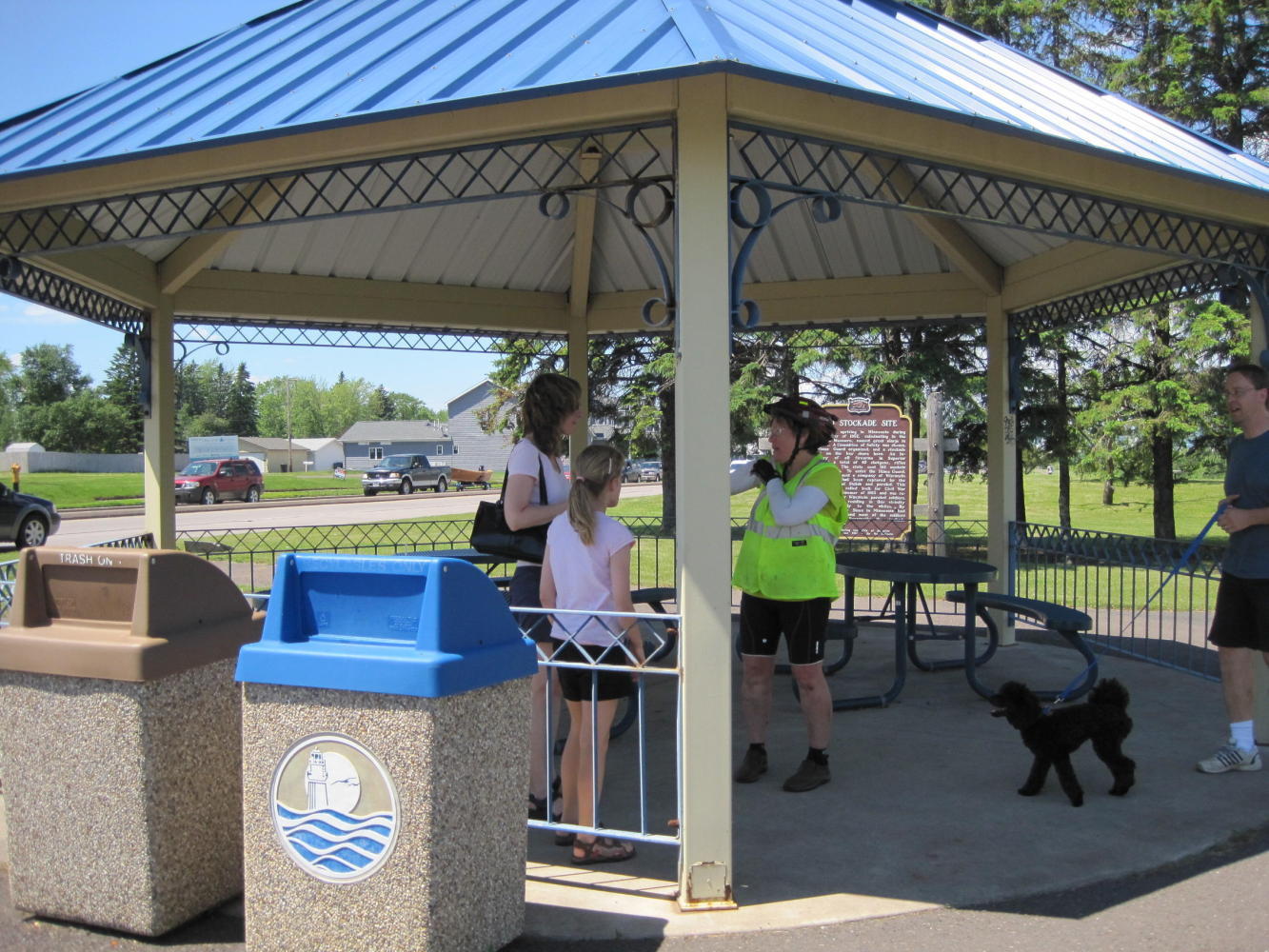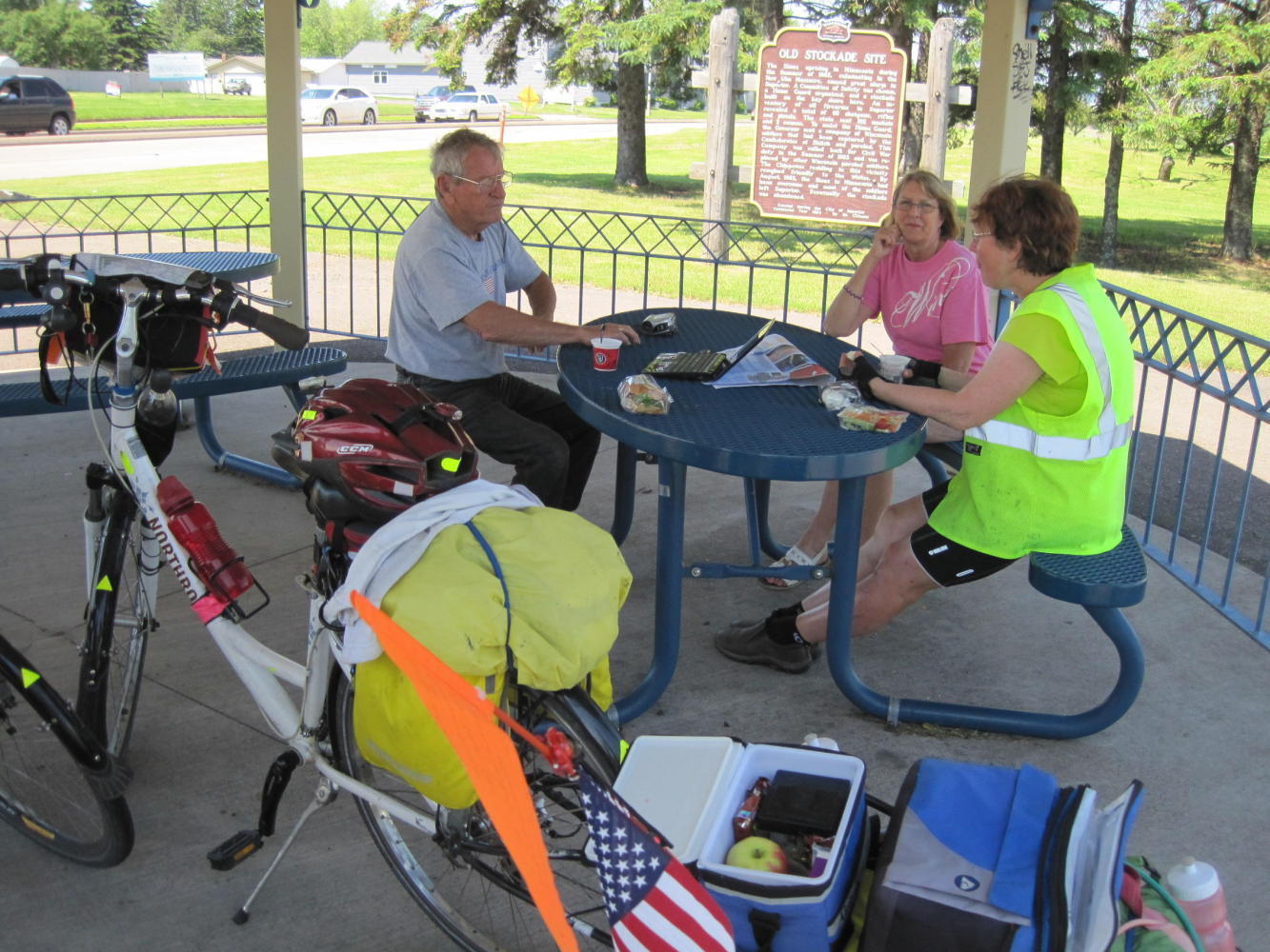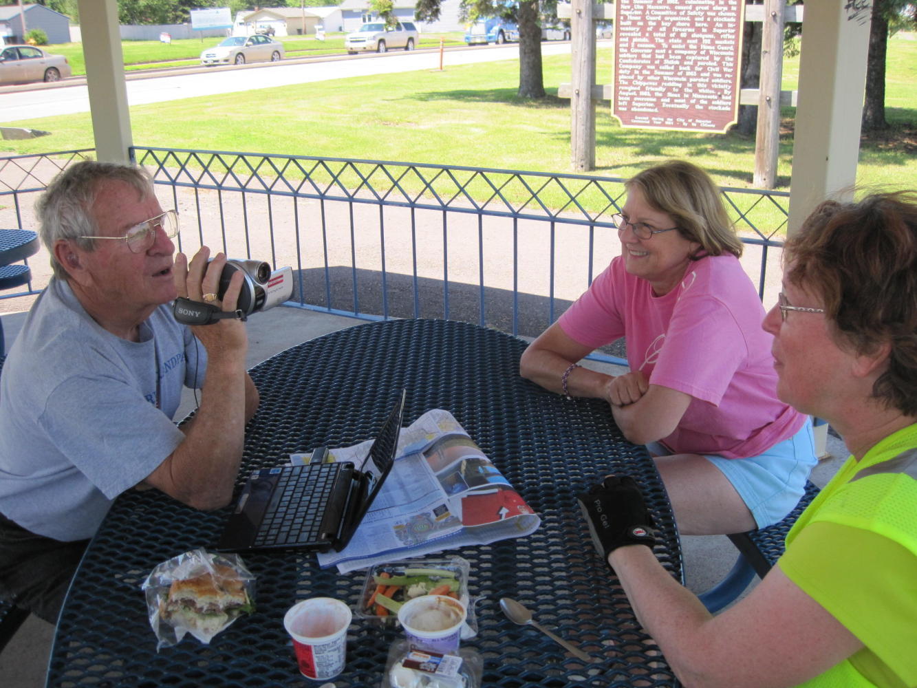 Along the trail we found a gazebo, ideal for lunch. It was deserted and we pulled our bikes in. Within a short time a fellow came to read the historical marker nearby. Naturally reserved, Norm, did not approach us at first. However, and inevitably, we did chat. Norm was quite taken with our journey. He called over his wife, Linda (?) and explained the trip to her. He went to get his video camera, and recorded some UQs for the folks back home.