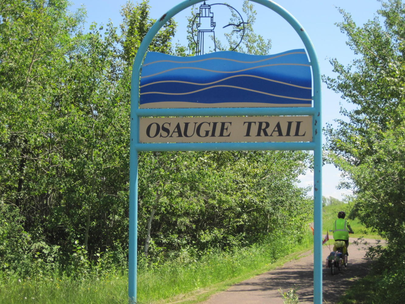 Just beside the centre we hooked into the Osaugie Trail. This turned out to be paved for about 10 km, going exactly our way. After that is continues as crushed limestone into Michigan! The trail lead by the Meteor, which you can see below: