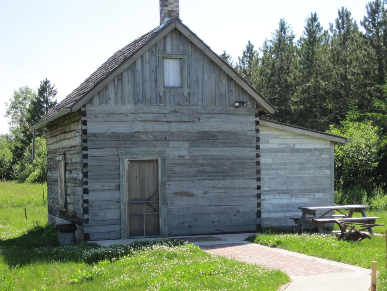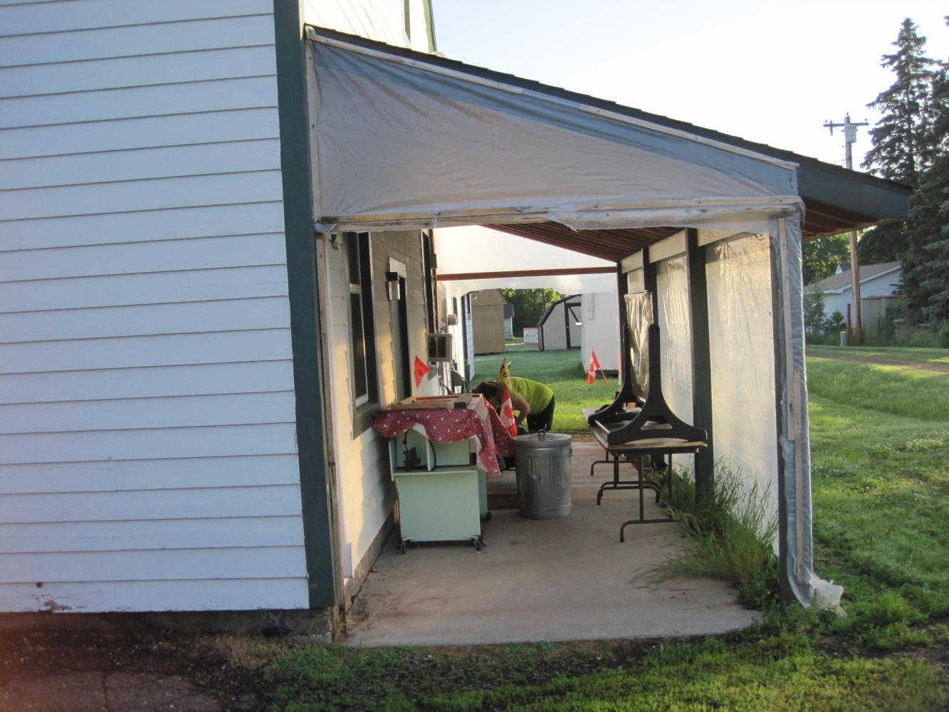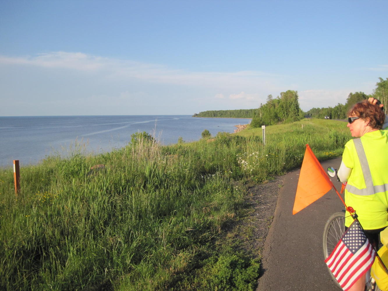 Eventually the road went into a long (10 km) gentle downhill, heading for the lake. We pedalled along gamely, as the sun got lower. We arrived at Port Wing at 8:30 but the little store was closed. We scouted the area and found lots of stealth camp opportunities, including the campground (operated out of the (closed) little store). We chose to stash ourselves in a sort of lean to behind the community hall. It was covered so we did not use the tent fly. Even here by the Lake it is hot and very humid. Having just the mesh is a plus and the lean-to provided the rain cover.