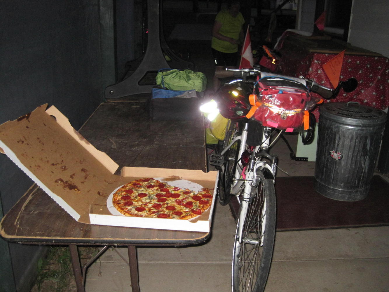 Working with a tip from a lady along the road, we made our way to the Port Bar, the only place open, and they made us a pizza. We dragged it back to our lean-to and partied on pizza and water. No chance to work on the blog, since mosquitoes were thick and internet was not. The mosquitoes piled into the tent when we did, and our best efforts at hunting them were not entirely successful.