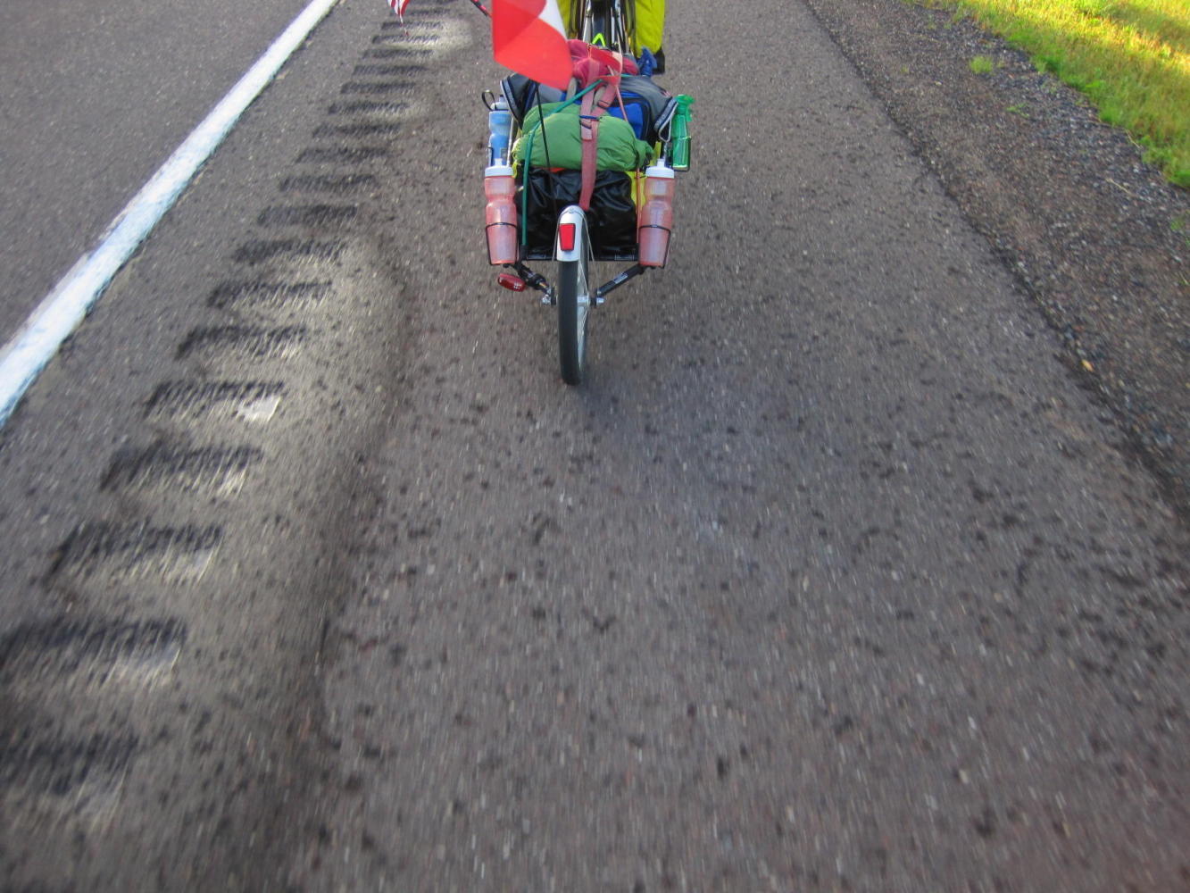 Hwy 2 started off with a wide shoulder protected by rumble strip, and kept up the performance all the way we travelled today. Traffic was very light, and we counted fewer than 20 trucks all day. So so far we are OK with our choice.