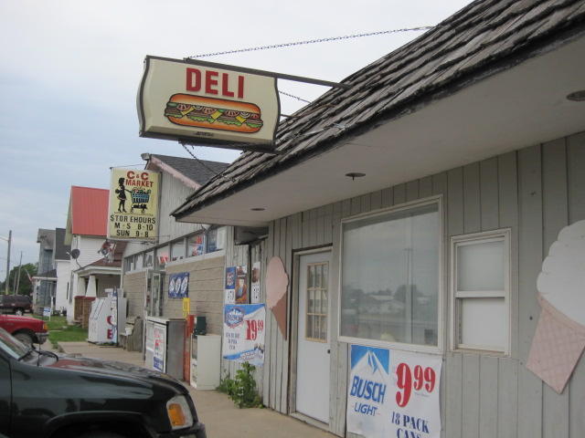 We headed off towards Escanaba, which would be the first town on our route on Lake Michigan. Soon enough we got hungry and began looking for a place for lunch. We found a few places as we passed though the towns of Loretto, Waucedah, Hermansville, Spalding, Wilson, and Harris but they were either scuzzy or shut down or were actually bars. Finally we turned in to Bark River, determined to find something, since at now 4 p.m. it had been crackers and an apple (plus cookies at the mine) for breakfast, and then ½ bag of chips at lunch. The restaurant in Bark River was long ago out of business. However everyone said we should go to the 'deli' which turned out to be a counter in the C&C Grocery. The deli featured little and when Dodie saw that the deli worker went to the washroom and did not wash his hands, we beat a retreat.